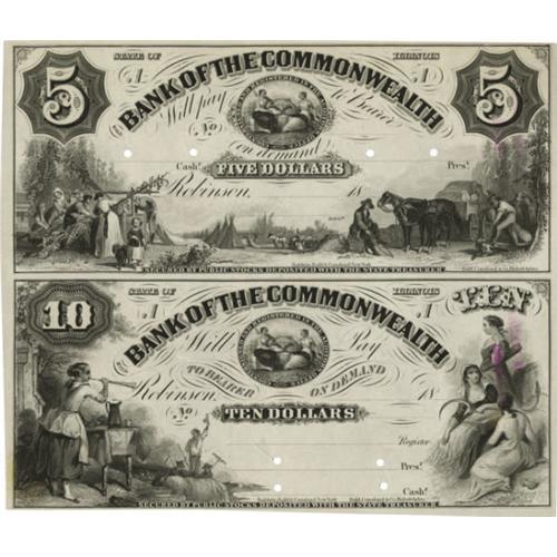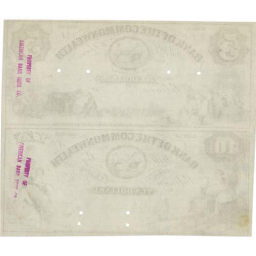 <B>Robinson, IL- The Bank of the Commonwealth</B></I> $5-$10 18__ G2-G4 Proof Uncut Sheet<BR> This is a rare bank with these being the first notes we have encountered. This Proof uncut sheet is ex-ABNCo archives. The farming vignettes are very detailed, but several of the small punch cancels have small tears. <B>Crisp Uncirculated, </B></I>8 POC.<BR><BR><b>Shipping:</b> Coins & Currency (<a target="_blank" href="http://www.heritageauctions.com/common/shipping.php">view shipping information</a>)