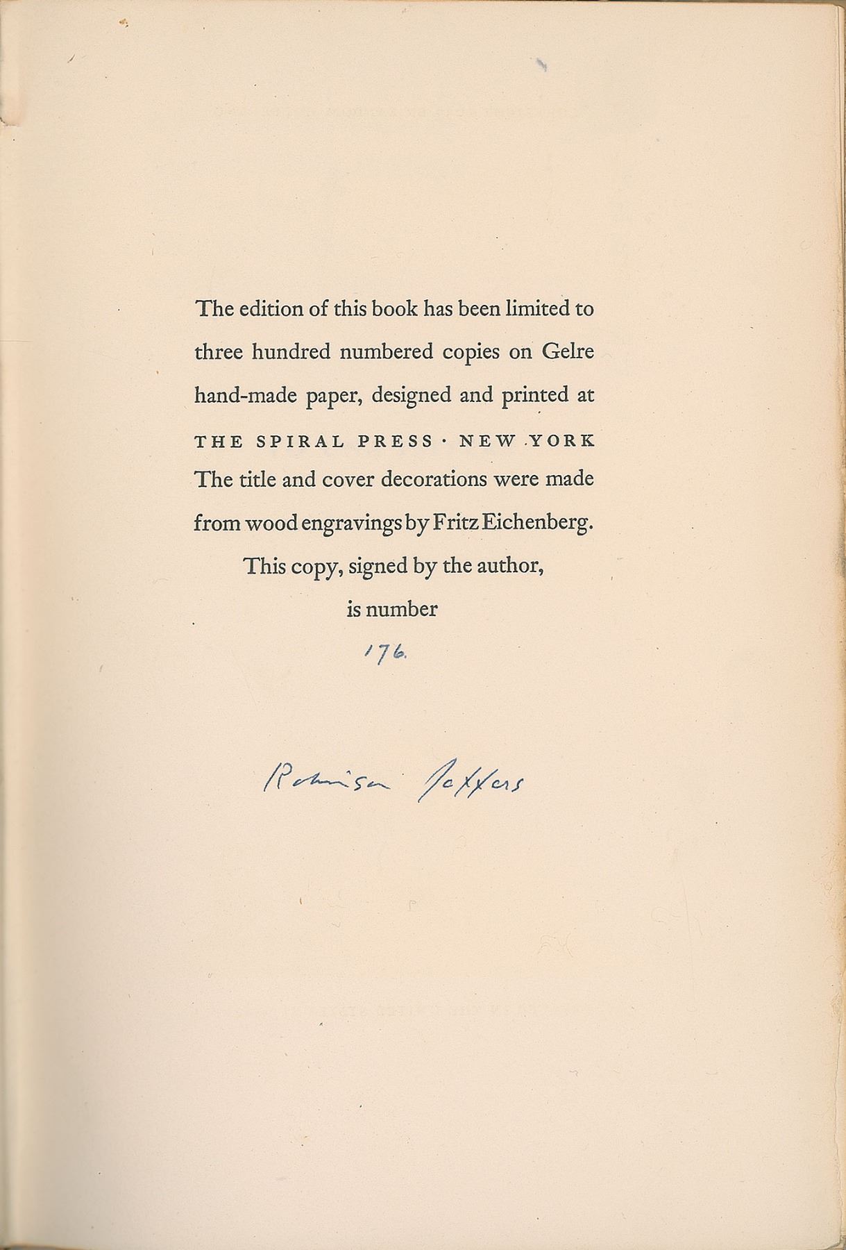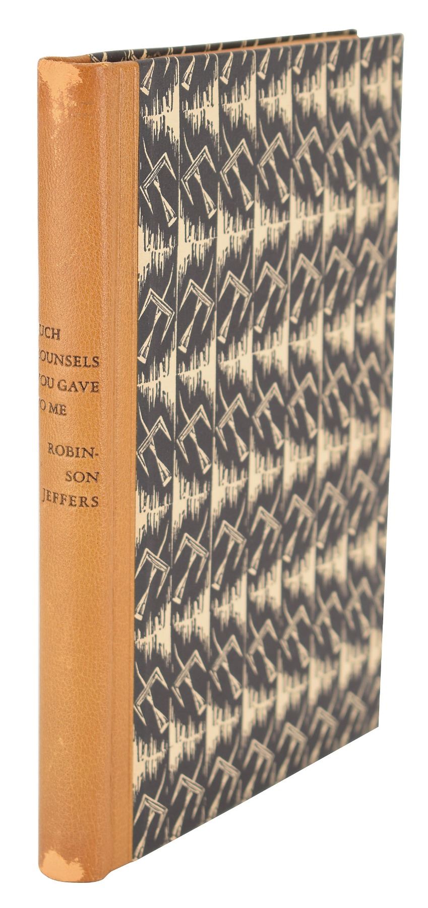 Signed book: Such Counsels as You Gave to Me & Other Poems. First edition, limited issue, numbered 176/300. NY: Random House, 1937. Hardcover with slipcase, 5.75 x 8.25, 129 pages. Signed on the colophon in fountain pen, "Robinson Jeffers." In fine condition, with rubbing at spine ends. A handsome volume with title and cover decorations made from wood engravings by Fritz Eichenberg.