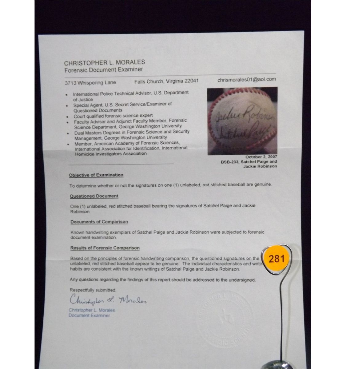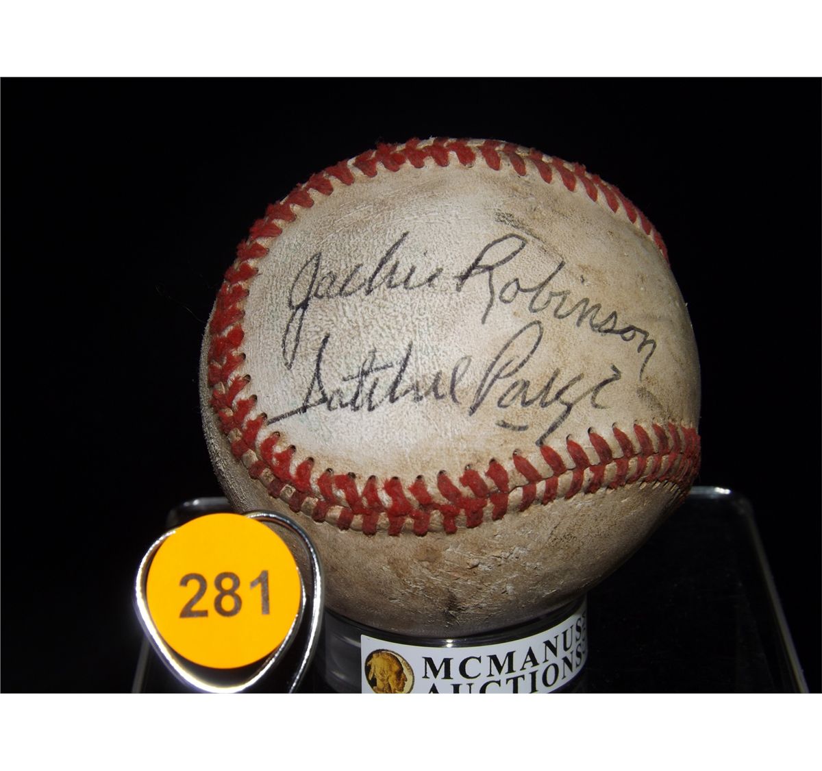 Robinson & Paige Autographed Baseball. Unknown Baseball with Autographs of Jackie Robinson and Satchell Paige. Appraised or estimated retail value $9000. COA by Christopher Morales. All Sales Final. Please see terms and conditions of auction.