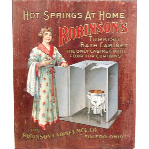 Robinsons Turkish Bath Cabinet ad on wood MFG by Mericord Co Chicago depicts product and robed woman 10" x 12"
