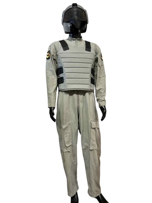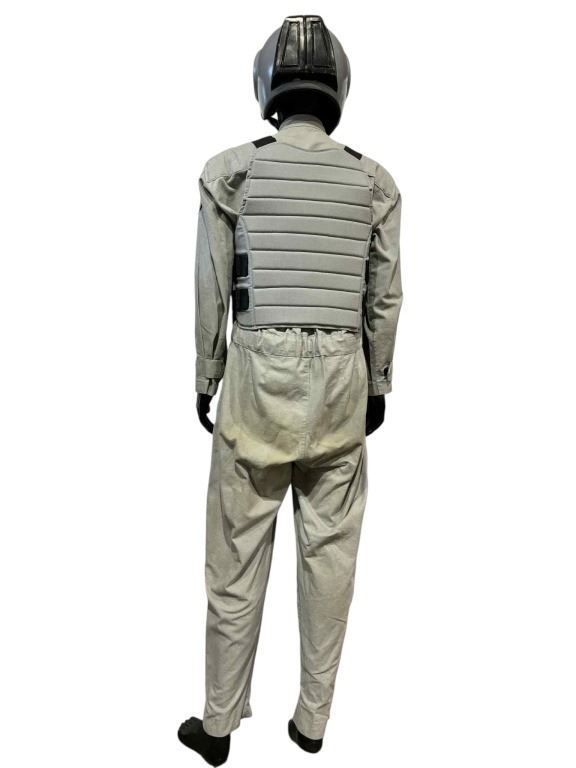 Original costume & helmet used by a member of the OCP Security Force in the Fred Dekker directed science fiction action film 'RoboCop 3' (1993), set in the near future in a dystopian metropolitan Detroit, Michigan, the plot centers around RoboCop (Burke) as he vows to avenge the death of his partner Anne Lewis (Allen) and save Detroit from falling into chaos.