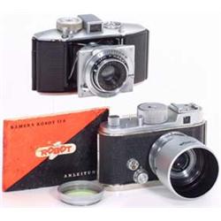 1) Berning & Co., "Robot IIa", 24 x 24 mm, ab 1951, Nr. C 113.694, Schneider Xenar 2,8/38. Anleitung, Robot-Sonnenblende, Filter. - With manual, filter and lens hood. (3/2) - Und: 2) Agfa: "Karat", 24 x 36 mm, 1939, Solinar 3,5/50, Compur-Rapid. Die ausgereifteste Vorkriegs-"Karat". - Last pre-war version! (2/2) - € 175/225 - (38/4)
