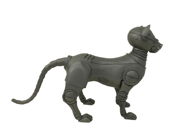 A Y2K-era robotic cat sculpture that was designed by Dave Nelson and Norman Tempia of AnimatedFX, a Los Angeles-based company specializing in animatronics, puppets, and special effects for film and TV. With decades of experience, AnimatedFX has created countless memorable characters for the entertainment industry. This static sculpture captures the essence of their robotic creations, offering a unique and futuristic piece for any collector.