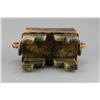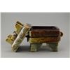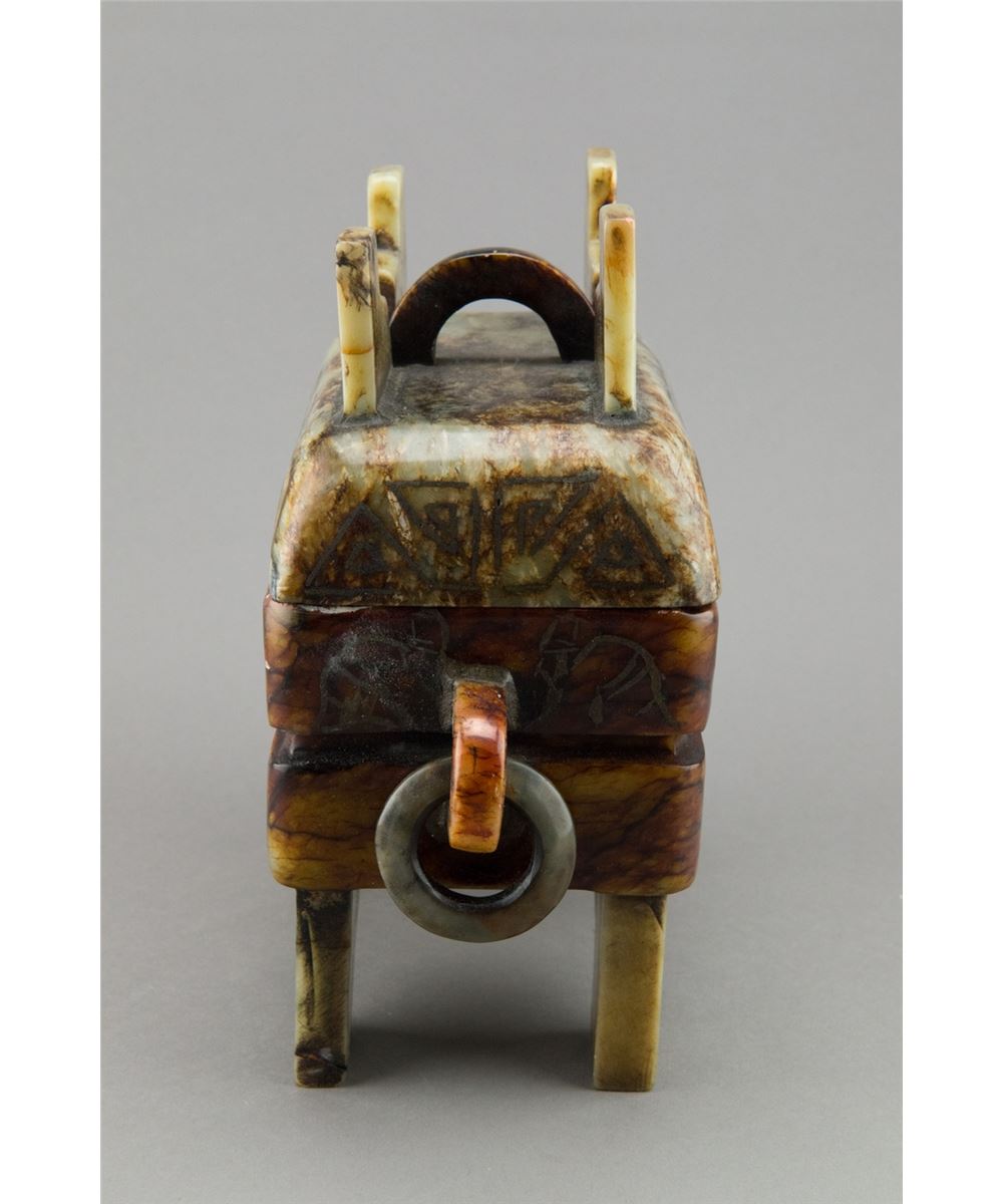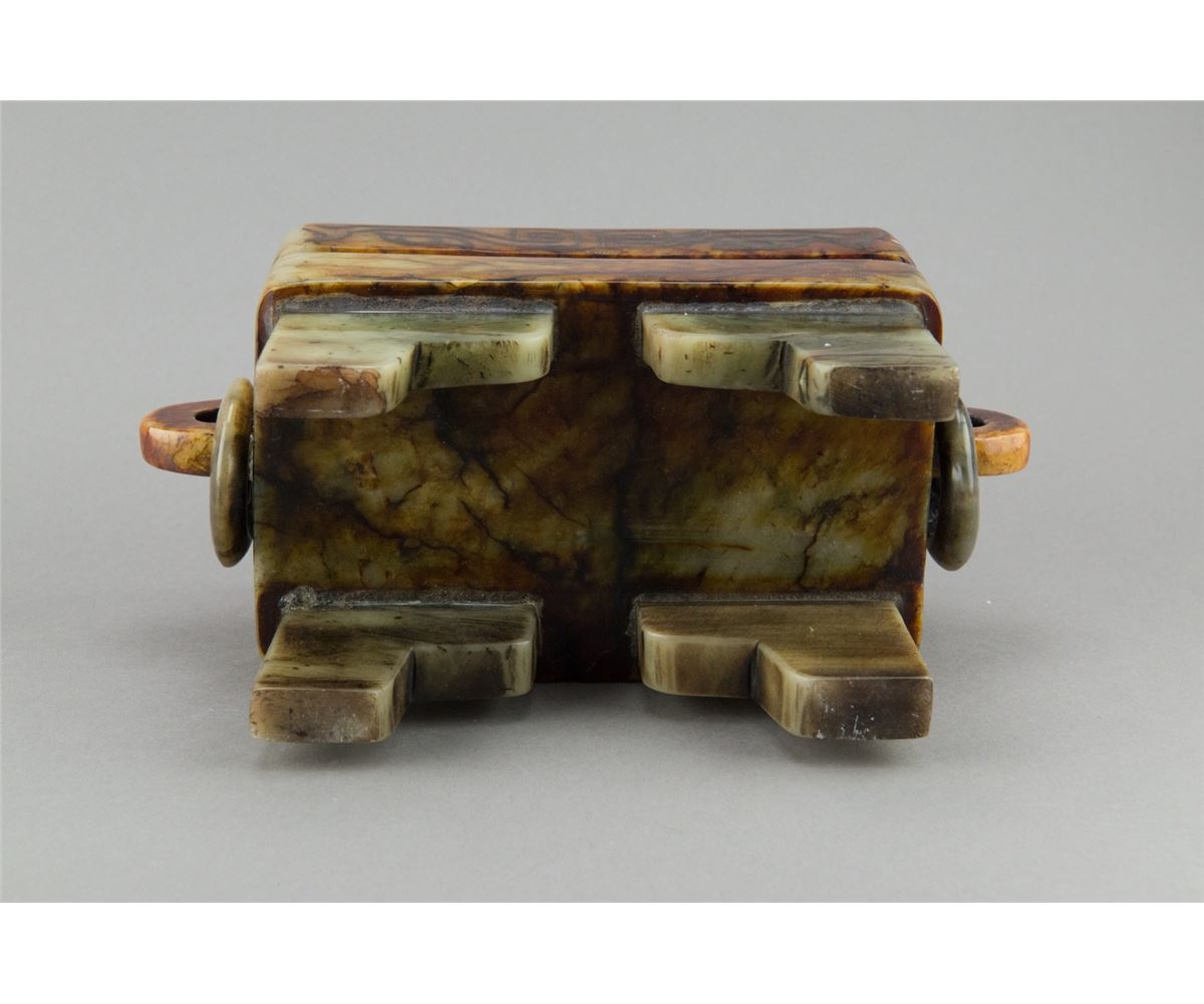 The box shaped body carved with simplistic archaistic designs, supported on four foots and flanked with two handles with loose rings. H: 23 cm, L: 11 cm, W: 24 cm, 4059 grams.