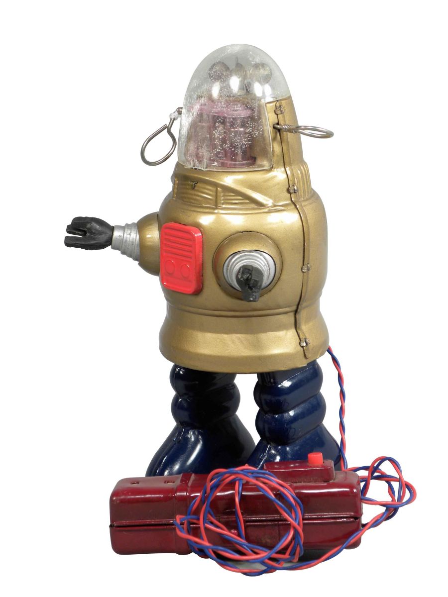 Roby Robot, battery operated toy. Made in Japan. Small dent on right side, left thumb broken and crazing of the clear plastic otherwise good condition. 8 inches tall.