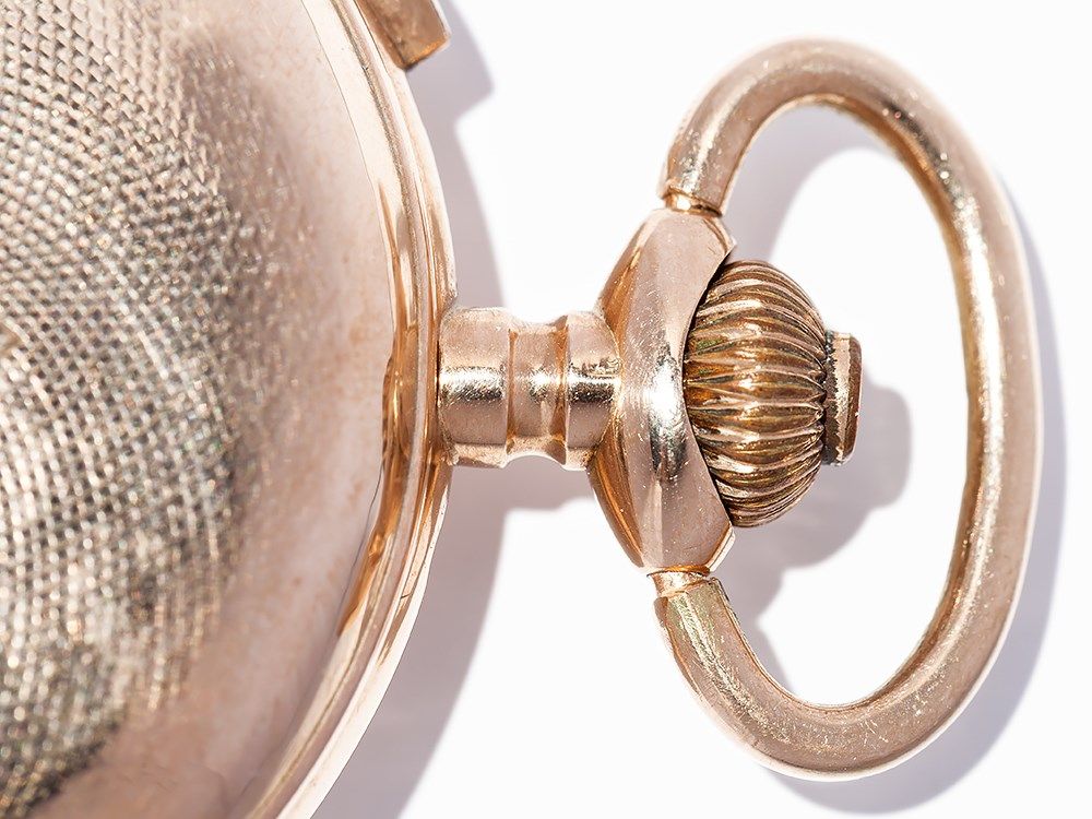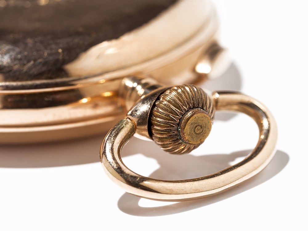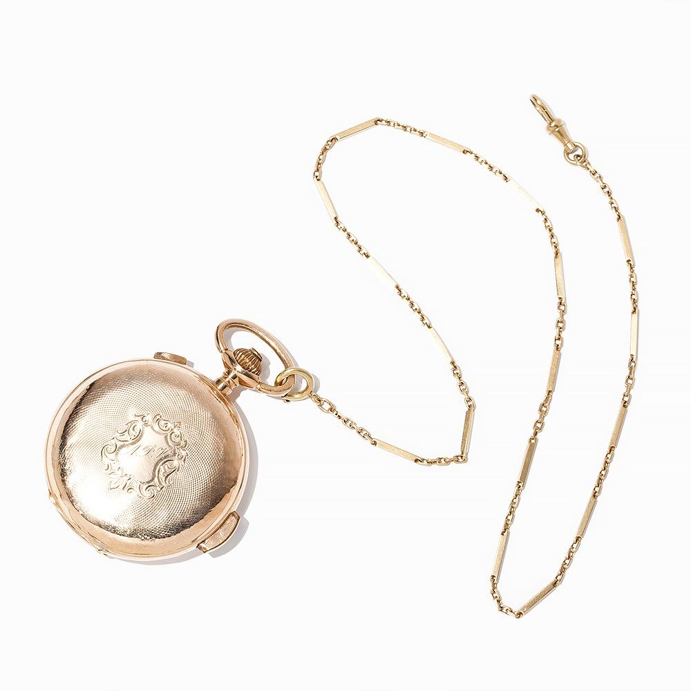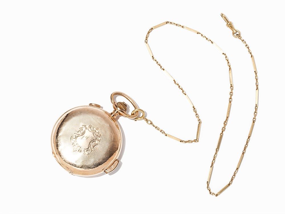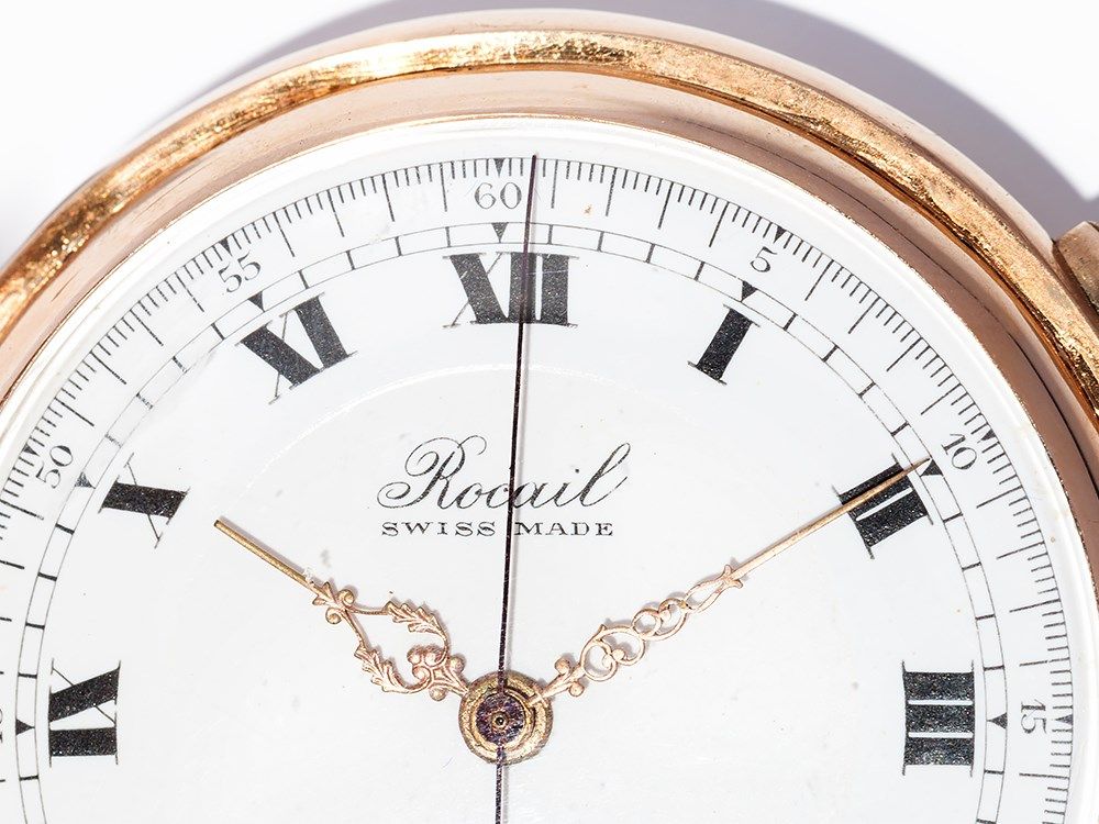 This Rocail chronograph pocket watch with minute repetition was made in Switzerland around 1890. The watch is fitted with a crown wound movement and displays hour, minute, second and chronograph. The white enamel dial shows oriental hands. The watch case is made of 14K gold and has a gold chain. The watch case number is 5515. The watch case cover is hallmarked and has a monogram engraving.