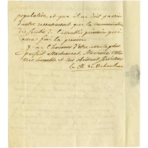 <B>Rochambeau Manuscript Letter Signed</B></I> “<I>le Cte de Rochambeau,</B></I>" 1.5 pages, 6” x 7.75”, front and verso. At Rochambeau near Vendôme April 22, 1790. Integral leaf addressed to “<I>Monsieur de Versailles-/Police Chief of the King for the/Department of Loir and of/Cher/at Romorantin.</B></I>” In French, translated. In full, <I>“The two questions you ask me, Sir, seem to me to have been answered by the explanations in the text issued by the Constitutional Committee, a printed copy of which I sent to you through Mr. Lancoigne. It seems to me that only the old clergy 'les religieux faisant vieu' should be excluded from rights of active citizenship. With respect to the reserves in the salt storehouse, it seems to me they are excluded by the decrees, since the committee was favorably disposed only toward the Legratiers. You must have noted from the explanations of the committee that each primary assembly section, or each primary section of the same canton is to name its number of deputies in proportion to its population, and that there is to be no other census than the report of the poll of the primary assembly which will have finished first. I have the honor of being, Sir, your very humble and obedient servant.</B></I>” Loir-et-Cher was one of the original 83 departments created during the French Revolution on March 4, 1790, seven weeks before Rochambeau wrote this letter. It was created from parts of the former provinces of Orléanais and Touraine. Rochambeau was born and lived in Vendôme, Loir-de-Cher. In 1780, French Lieutenant General the Count of Rochambeau arrived at Newport, Rhode Island, in command of 6,000 French troops with a fleet commanded by the chevalier de Ternay. In July 1781, his troops joined Washington's forces in White Plains, N.Y., and marched south. Linking up with a French fleet at the head of Chesapeake Bay, they joined Lafayette's forces and the 14,000 troops besieged the British position, forcing their surrender on October 19, 1781, ending the war. In 1791, Rochambeau was made a Marshal of France and given the command of the Northern armies. He was arrested during the Reign of Terror (1793-1794) and narrowly escaped the guillotine. Fine full impression of Rochambeau's black wax seal depicting the Rochambeau family crest with three six-pointed stars interspersed with a chevron. This crest appears on the pedestal of the Rochambeau statue in Lafayette Park, across the street from the White House. There is a seal tear in a blank area on the integral leaf. With light folds, the letter is in very fine condition. Accompanied by a small portrait of Rochambeau.<BR><BR><b>Shipping:</b> Flat Material, Small (<a target="_blank" href="http://www.heritageauctions.com/common/shipping.php">view shipping information</a>)