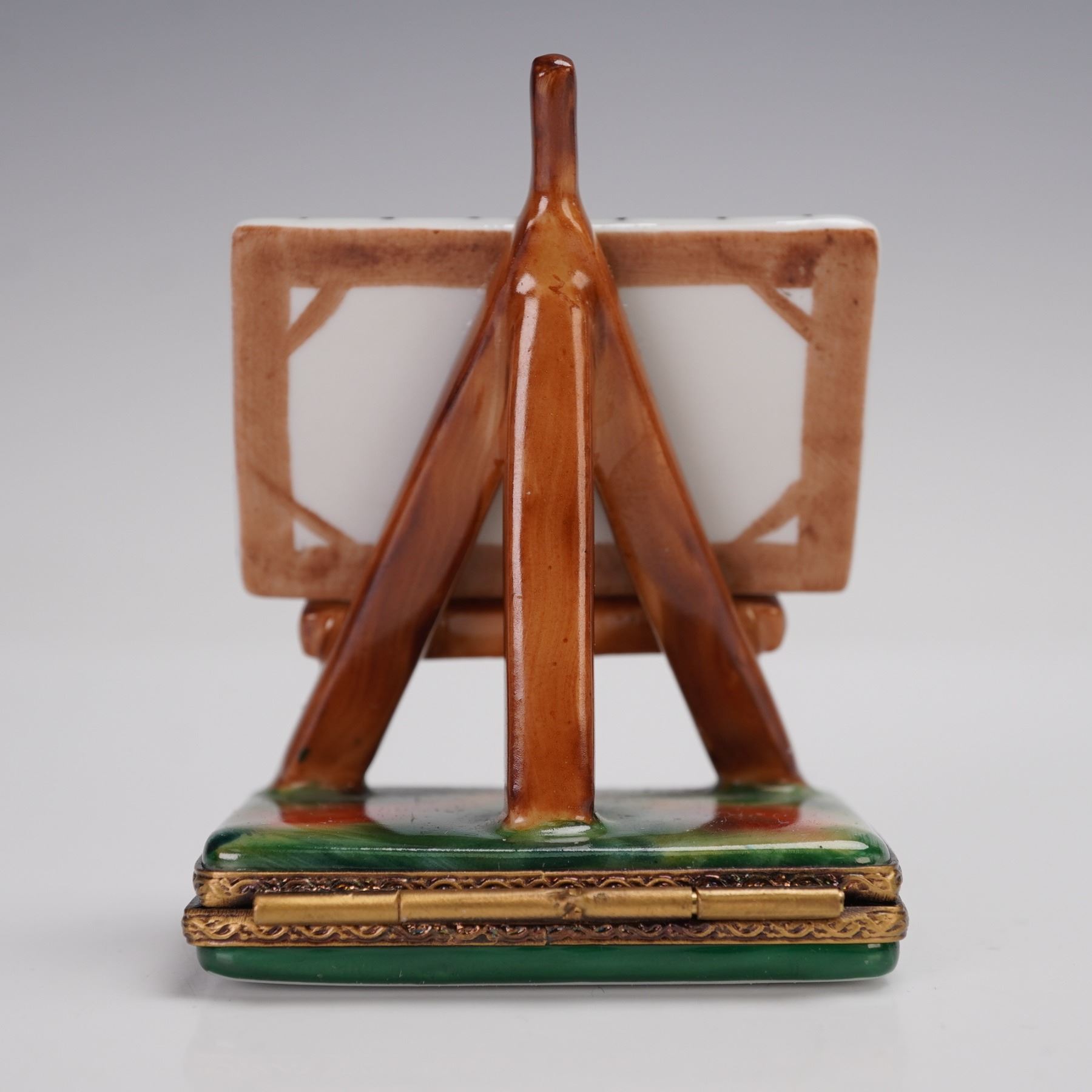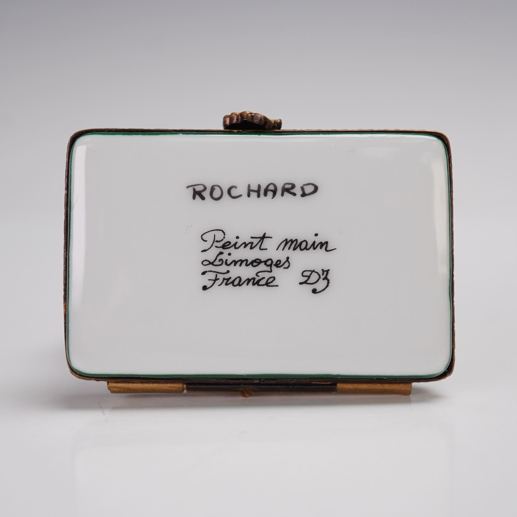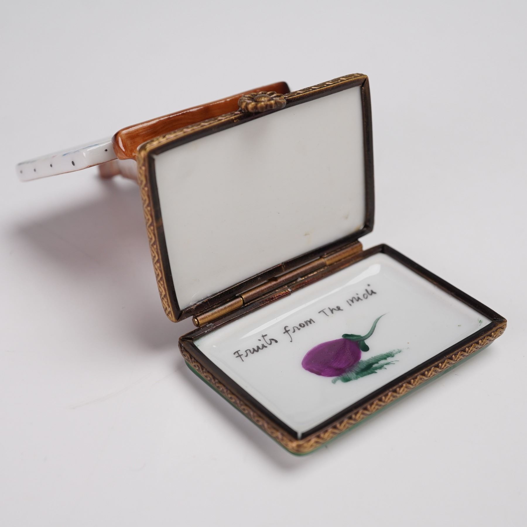 This Rochard Limoges treasure box features a hand-painted still life of fruits on a canvas displayed on an easel. The vibrant artwork includes grapes, pears, and other fruits beautifully painted on the canvas. The treasure box is crafted from porcelain and features a green base with ornate gold-tone detailing. Inside, you'll find the inscription Fruits from the Midi, along with the signature Rochard and Peint Main Limoges France on the base. This unique treasure box captures the essence of French craftsmanship and is a perfect addition to any collection.