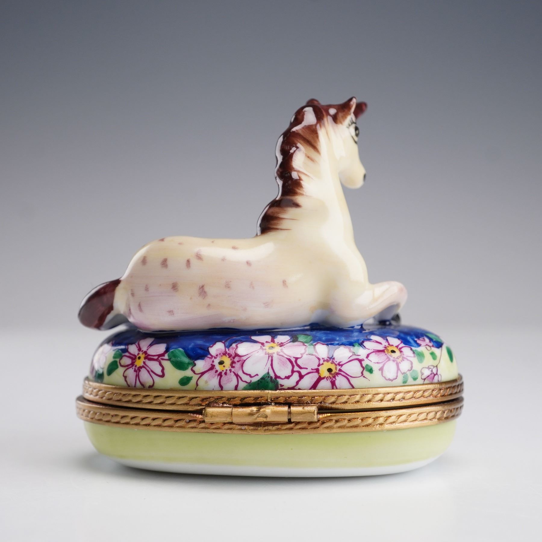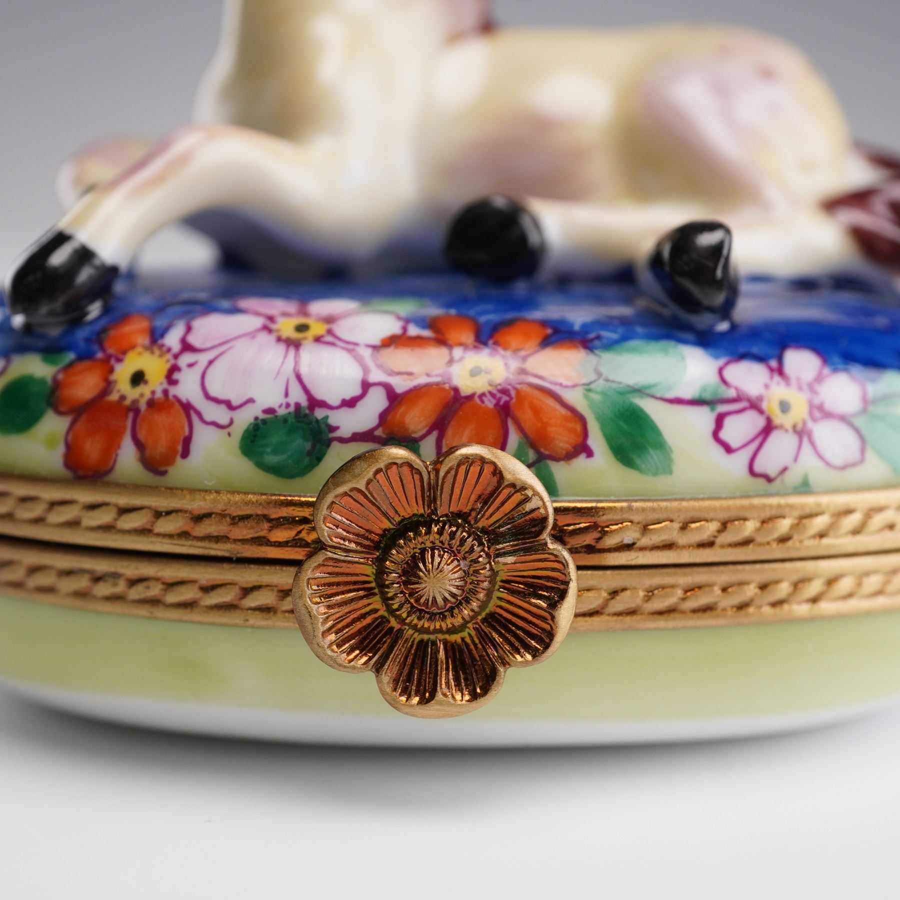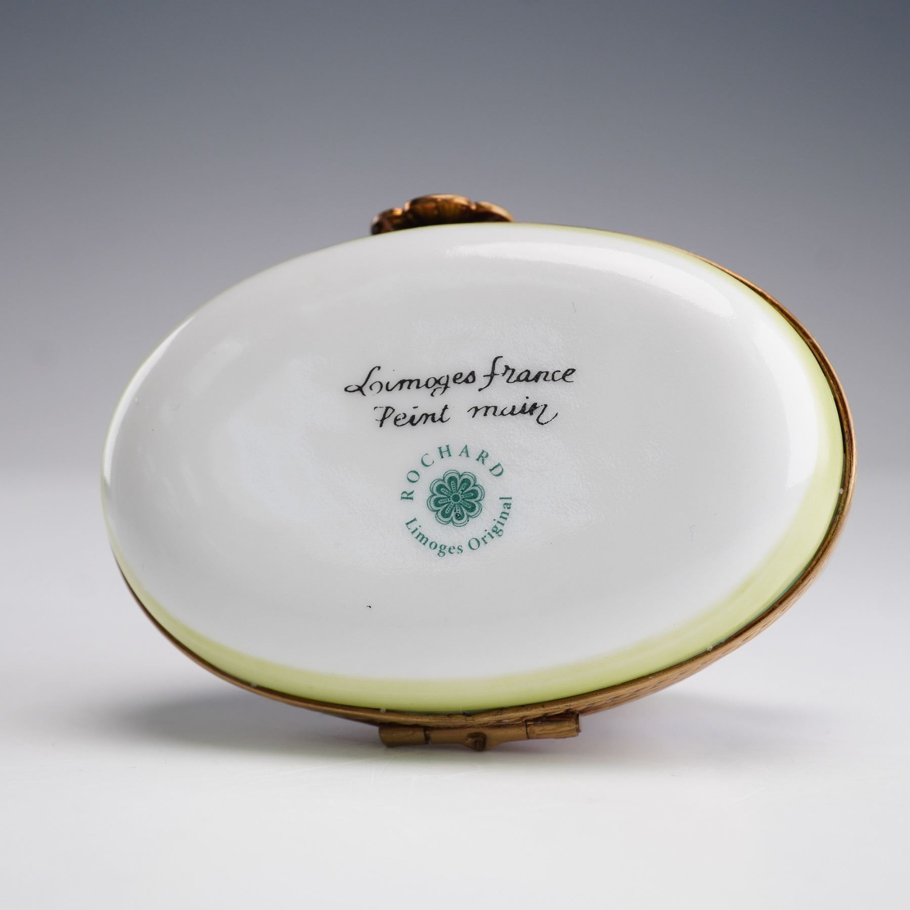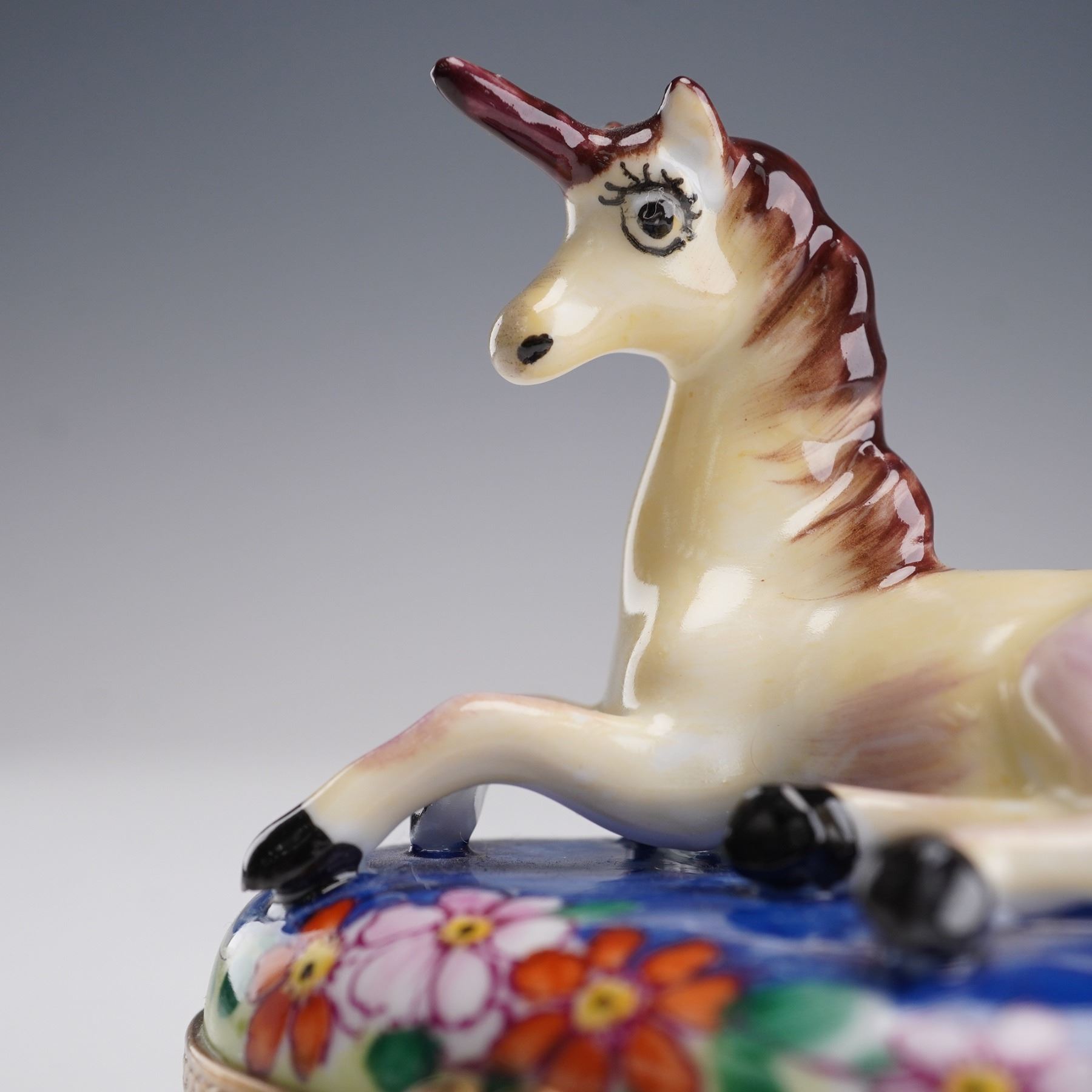 Hand-painted porcelain trinket box, depicting a reclining unicorn atop a colorful floral base. The oval form features finely detailed brass fittings with a flower-shaped clasp and a painted floral interior. Marked on the underside with Limoges France, Peint Main and the Rochard Limoges Original insignia.