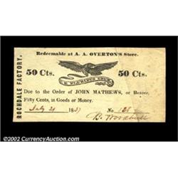 Rochdale Factory, MA- A.A. Overton's Store 50ó July 21, 1837An attractive example of this scarce scrip. About Uncirculated. Important notice: We expect to be auctioning lots at the rate of 200-250 per hour. Sometimes eBay Premier live bid software cannot keep up with that pace, so we strongly recommend that you place a realistic proxy bid now as insurance to avoid disappointment. Also please note that all Heritage/CAA lots purchased through eBay Premier carry a 20% Buyer's Premium. Please make sure you read the Terms and Conditions.