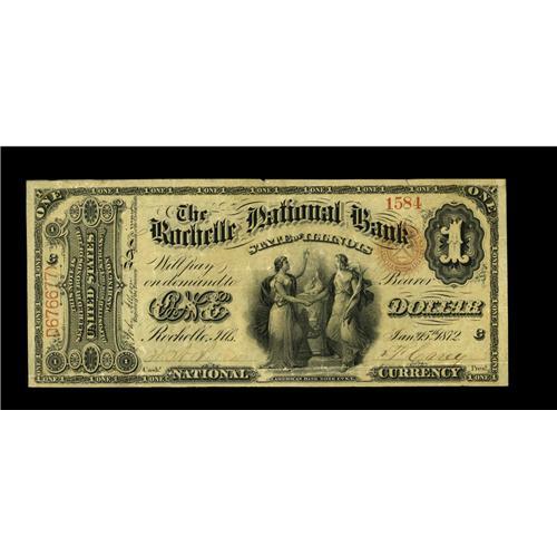 <B>Rochelle, IL</B></I> - $1 Original Fr. 382 <B>The Rochelle NB</B></I> Ch. # 1907<BR>A more than presentable <B>Very Fine</B></I> example that is one of four First Charter Aces to survive from here. Included in the census are all the sheet mates of this nicely margined note, including the Lazy $2, as well as one additional $1. While two banks issued from this small community, this is the only one to have any documented survivors. Although there is a tiny margin separation at top center, this note is otherwise well within the parameters of the assigned grade and merits serious attention from any Illinois collector who appreciates better First Charter material.<BR><BR><b>Shipping:</b> Coin/Currency (<a target="_blank" href="http://www.heritageauctions.com/common/shipping.php">view shipping information</a>)