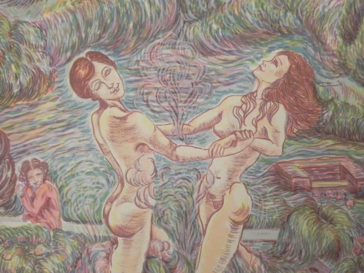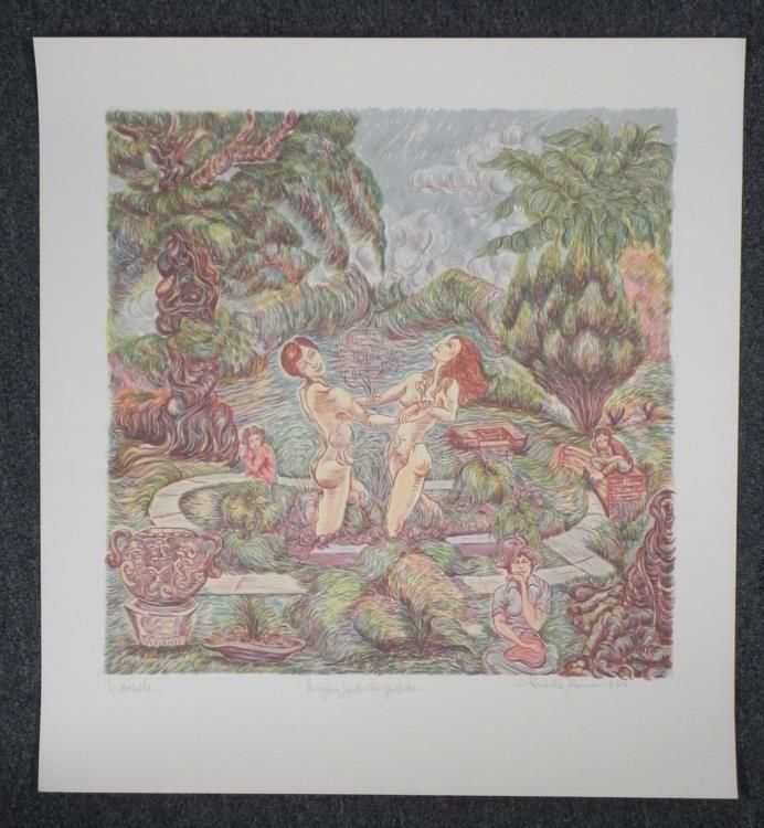 This scene is like the Garden of Eve, only as a celebration of nature, both pensive and joyous. * * * Artist: Rochelle Steiner * Signature: "Rochelle Steiner" in pencil, lower right * Title: Everything Speaks When You Listen * Medium: Lithograph on rag paper * Edition: Unnumbered, dedicated artist proof, marked "To Michelle," in pencil, lower left * Date: 1980 * Sheet size: 24 1/2 x 26 1/2 nches * Condition: Excellent * * * Biography: * Wayne Ensrud (1934 - ) received his BFA from the Minneapolis Institute of Art, where he met fellow artist Oskar Kokoschka, who became a great influence on his work. In 1975 Ensrud was invited as the first American painter to exhibit at the French Institute Gallery, N.YC. He became known in the world of fine wines for his pictures of Bordeaux and the vineyards. He has designed menus, posters, and advertising for many fine restaurants. He also worked as a free-lance art director and animator for major television networks, and taught art at Simon's Rock Early College. His commissioned work includes portraits of jazz legends Count Basie, and George Shearing, as well as a mural for the New York restaurant Larre. His art has appeared in numerous solo and group exhibitions in galleries and museums, and it can be found in selected public and private collections.