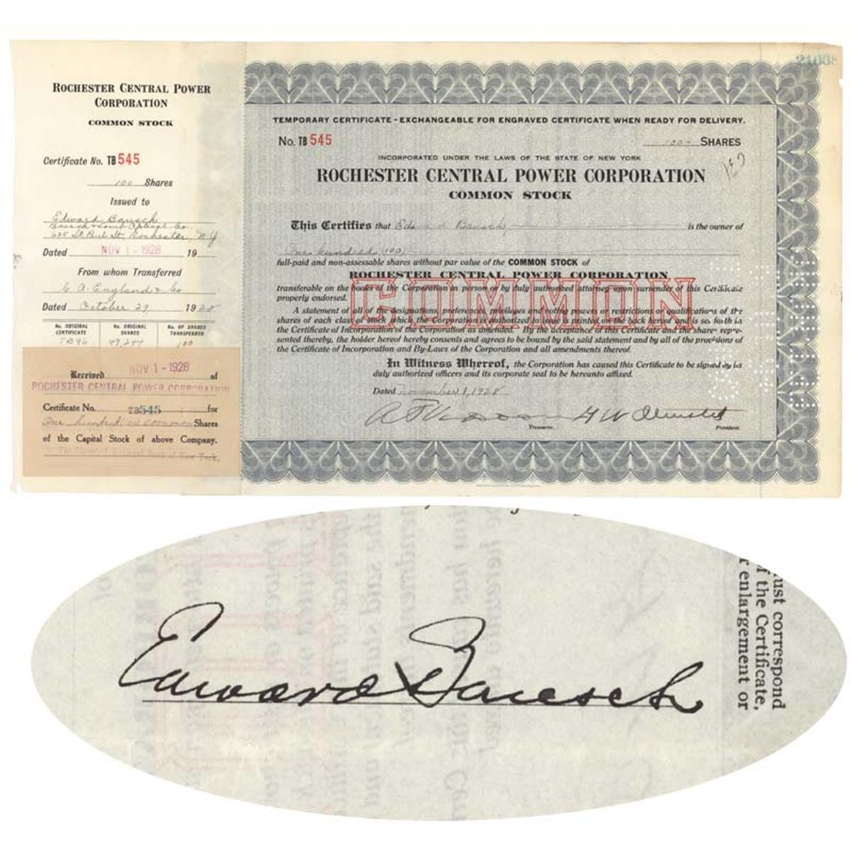 1928, New York. Stock certificate for 100 shares. Gray/Black with red overprint. Issued to and signed by EDWARD BAUSCH. Bausch was the son of the founder of Bausch & Lomb Optical Company, J.J. Bausch. Receipt, including Bausch’s address at Bausch & Lomb in Rochester, New York, is glued to the left margin. In fine condition overall. Perf cancellation not affecting Bausch’s signature.