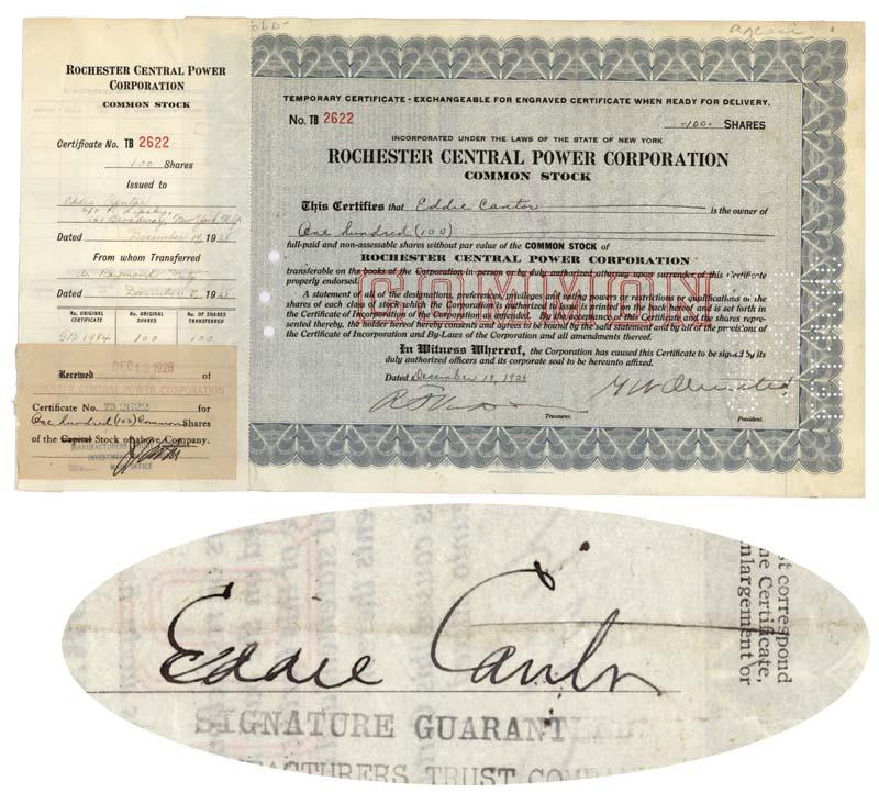 1928, New York. Stock certificate for 100 shares. Blue\Black. Issued to and signed on verso by EDDIE CANTOR. (1892-1964) Acotr and Singer. Cantor often performed in black-face. His credits include Kid Cabaret (1912) with George Jessel. In addition, Cantor worked for Jlorenz Ziegfeld, where he sand many of his best known songs, including “Making Whoopee.” Cantor also helped to found actors’ unions and promoted the March of Dimes. Stamp, perforation and punch cancellations do not affect Cantor’s signature.