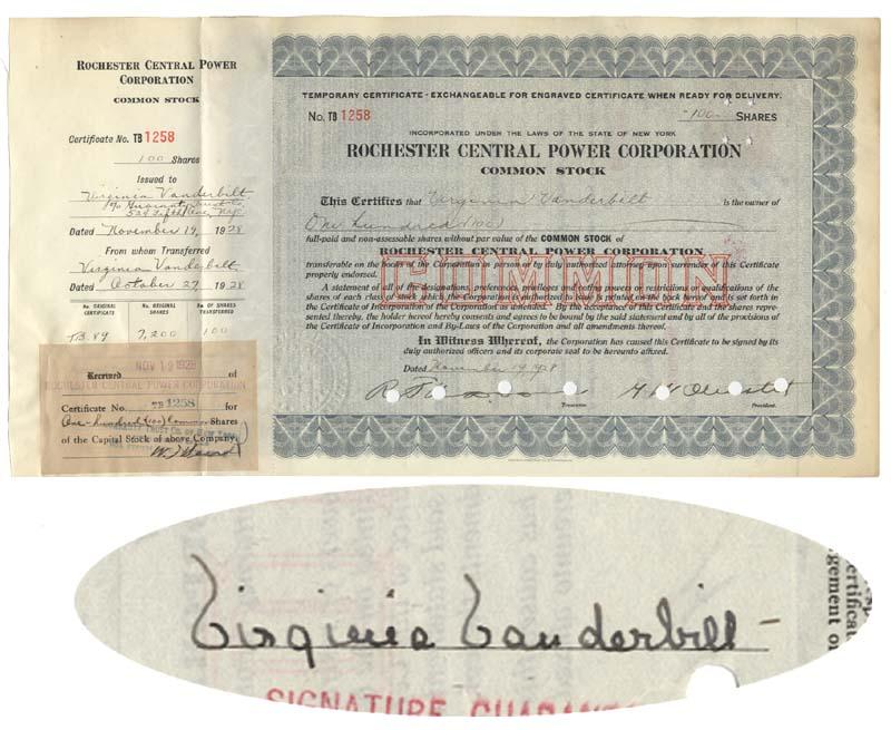 1928, New York. Stock certificate for 100 shares in the Rochester Central Power Corporation. Blue/Black. Issued to and signed on verso by VIRGINIA VANDERBILT wife of William K. Vanderbilt, Jr. Punch cancellations not affecting bold signature. Very Fine.