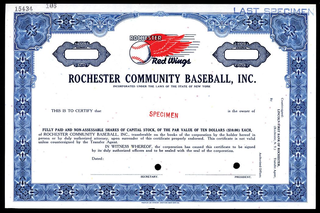 Rochester, New York, Specimen Stock, Odd Shares, Black on blue border and underprint, Team logo top center in red and blue, POC's, XF condition, FL-ABNC.