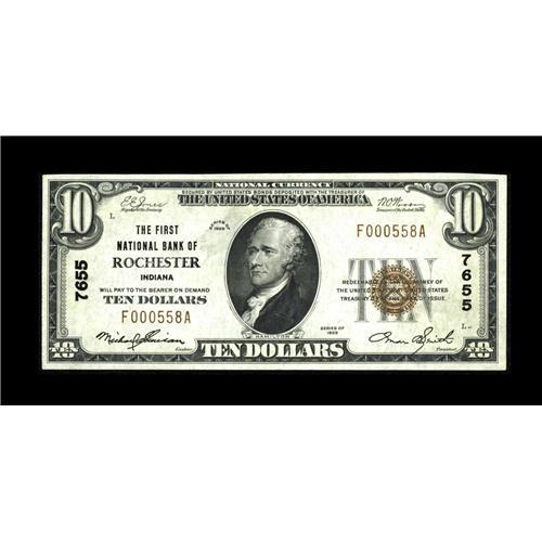 <B>Rochester, IN</B></I> - $10 1929 Ty. 1 <B>The First NB</B></I> Ch. # 7655<BR>While not an exceptionally rare bank, the highest grade small note listed in the census grades only Very Fine. This lovely example raises that bar considerably. Crackling fresh <B>Extremely Fine-About Uncirculated.</B></I><BR><BR><b>Shipping:</b> Coin/Currency (<a target="_blank" href="http://www.heritageauctions.com/common/shipping.php">view shipping information</a>)