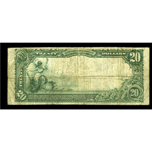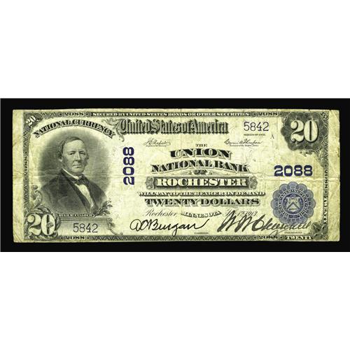<B>Rochester, MN</B></I> - $20 1902 Plain Back Fr. 655 <B>The Union NB</B></I> Ch. # 2088<BR>Only two banks in the state of Minnesota issued notes with the scarce Napier-Thompson Treasury signature combination. This note also carries dark signatures of the cashier and vice president. <B>Fine.</B></I>