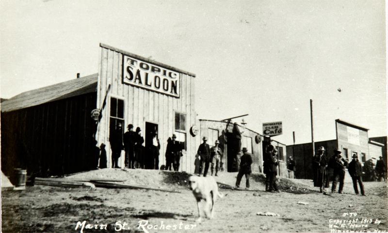 A real photo postcard showing the Topic Saloon in foreground, with the Rochester Club Café next to it and other businesses along the dirt street of “Main St. Rochester” card. Numerous men are standing about and a dog trots toward the camera. Photo #5-J9. Copyright 1913 by Wm. E. Moore, Winnemucca, Nev. Unused and not postmarked. Excellent condition. No tears, no stains, and no yellowing. Measures 5 3/8" x 3 1/4". Contrast is good. Focus is okay. This particular RPC was sold as an original but is in actuality a modern copy.