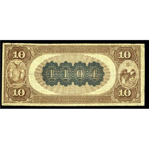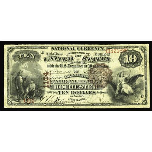 <B>Rochester, NY</B></I> - $10 1882 Brown Back Fr. 480 <B>The Traders NB </B></I> Ch. # 1104<BR>A solid <B>Very Fine</B></I> $10 Brown Back from the Empire State's snow belt. This institution was one of only two banks to issue Brown Backs from here. The census currently lists five survivors of this type and denomination from this issuer. The note we offer tonight is enhanced by fully legible officers' ink signatures. A couple of unobtrusive margin separations are mentioned for the sake of full disclosure, but fail to impact the overall aesthetic appeal of this attractive example.