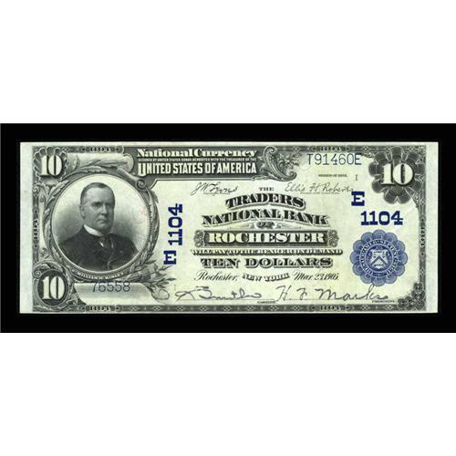 <B>Rochester, NY</B></I> - $10 1902 Plain Back Fr. 624 <B>The Traders NB</B></I> Ch. # (E)1104<BR>This <B>Choice Crisp Uncirculated</B></I> example is a new addition to the census from this bank which ceased operating in 1924. The paper is very original with plenty of embossing. The serial number is raised into the design a bit.<BR><BR><b>Shipping:</b> Coins & Currency (<a target="_blank" href="http://www.heritageauctions.com/common/shipping.php">view shipping information</a>)
