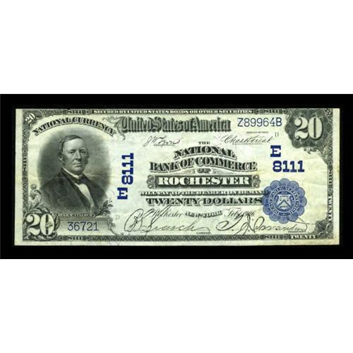 <B>Rochester, NY</B></I> - $20 1902 Plain Back Fr. 651 <B>The NB of Commerce</B></I> Ch. # (E)8111<BR> Large notes only from this bank, with this example one of just four Plain Back twenties listed in the census. <B>Very Fine+.</B></I><BR><I>From The Thomas A. Bergin Collection</B></I><BR><BR><b>Shipping:</b> Coins & Currency (<a target="_blank" href="http://www.heritageauctions.com/common/shipping.php">view shipping information</a>)
