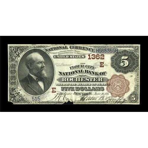 <B>Rochester, NY</B></I> - $5 1882 Brown Back Fr. 471 <B>The Flour City NB</B></I> Ch. # (E)1362<BR> On the plus side of the ledger for this $5 Brown Back is a nice occupational title, a lack of real wear, and some bank scarcity. On the minus side are closely trimmed margins, a missing bottom left corner tip, and a bit of damage under the Cashier's signature. <B>Very Fine</B></I> for grade but a bit damaged. <BR><I>From The Thomas A. Bergin Collection</B></I><BR><BR><b>Shipping:</b> Coins & Currency (<a target="_blank" href="http://www.heritageauctions.com/common/shipping.php">view shipping information</a>)
