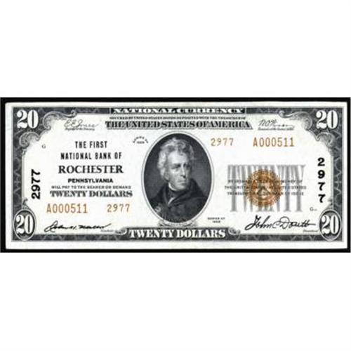 Rochester, PA $20 1929. FNB Charter #2977 CU