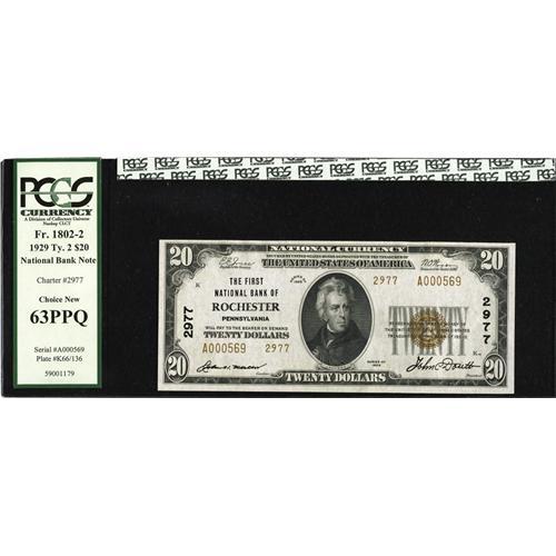 <B>Rochester, PA</B></I> - $20 1929 Ty. 2 <B>The First NB</B></I> Ch. # 2977<BR>Embossing, natural paper wave, bright paper, and dark inks are highlights of this <B>PCGS Choice New 63PPQ</B></I> $20.