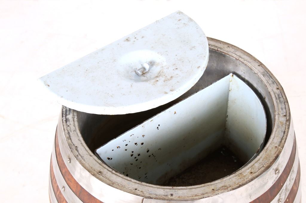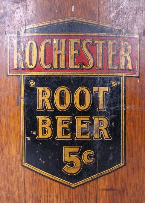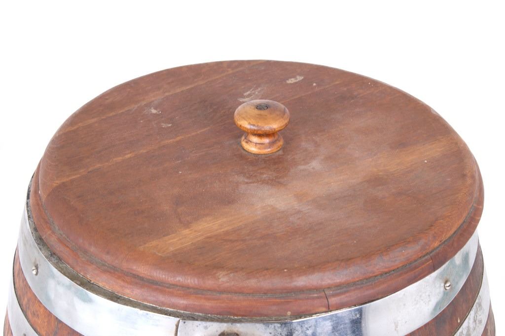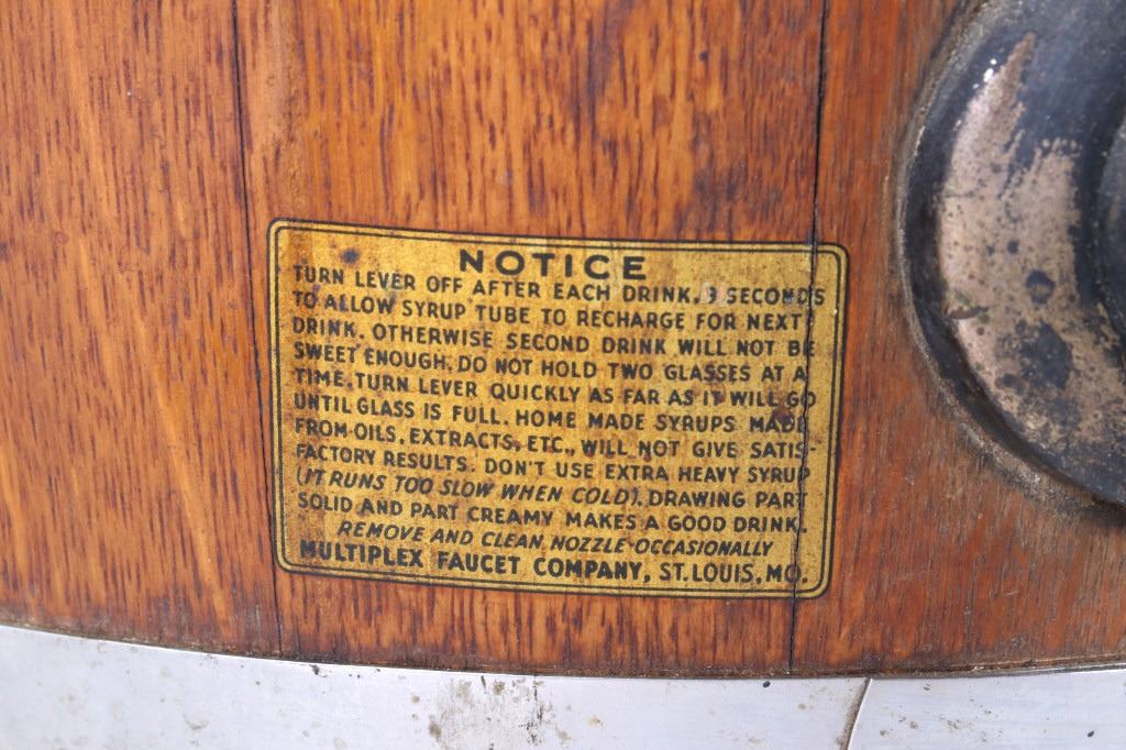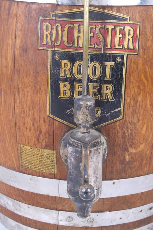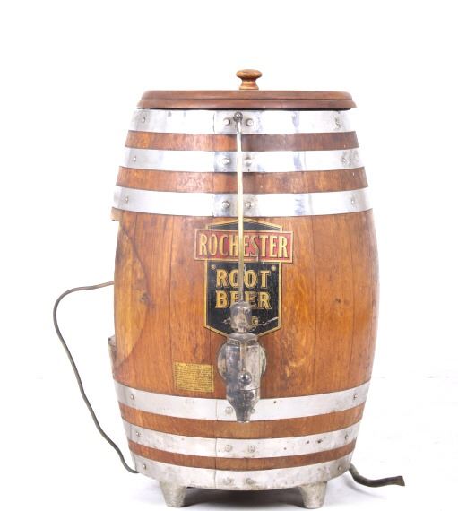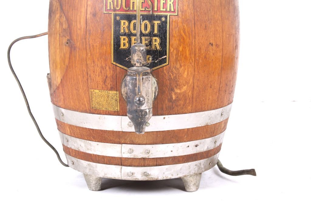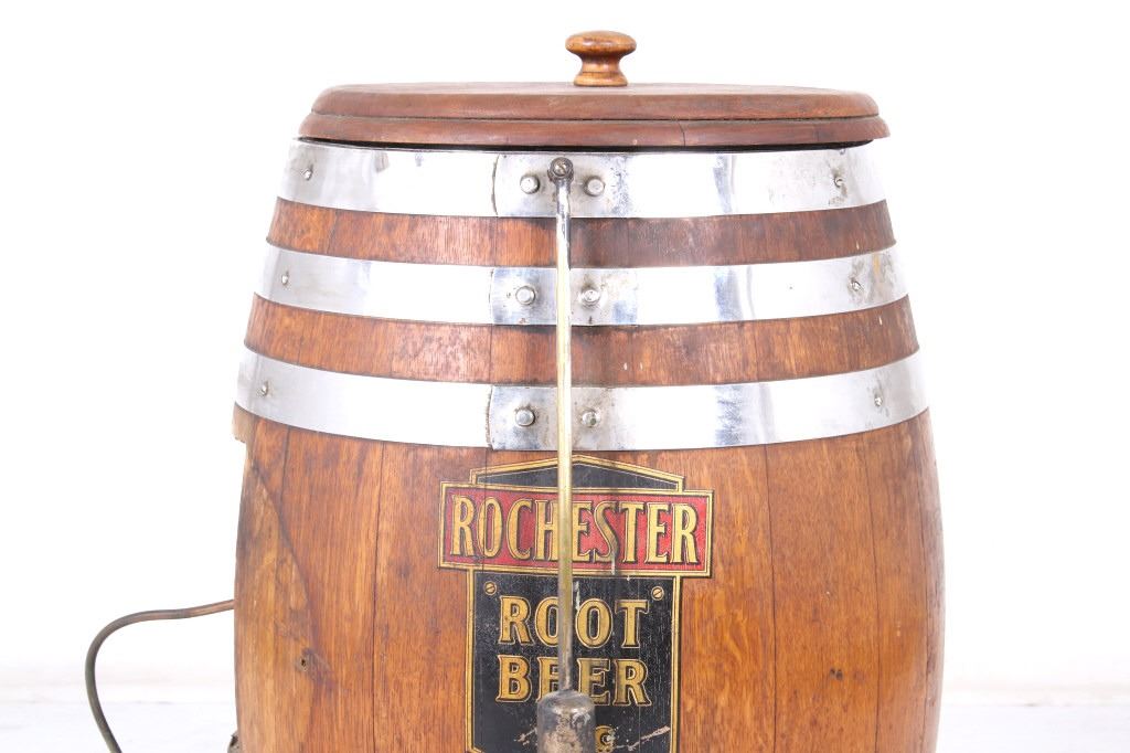 Featured in this lot we have a Rochester Root Beer soda barrel dispenser originating from the 1950's to 1960's. JHS and Rochester Root Beer were started by J. Hungerford Smith around the turn of the last Century in New York. Smith had developed a way of preserving fruit juices and making syrups for year-round use. He also developed his own root beer syrup and marketed his syrups to other drugstore owners. His syrups were of high quality and his Rochester Root Beer brand was well renowned. A&W Root Beer started making their root beer in California in the 1920's using syrup from J. Hungerford Smith (JHS). In 1963, The J. Hungerford Smith Company purchased the A&W Company , retaining the A&W name. The Rochester Root Beer trademark was last owned by A&W. The barrel shows oak construction with steel bands and bottom. The front shows a black and red decal with gold lettering reading "Rochester Root Beer 5 c" along with a notice sticker. The top and side shows metal internals and dispensing systems. The piece shows good condition overall with the side plate missing. The piece measures 28" tall with a diameter of approximately 17".