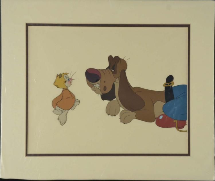 This is an original animation cel used in the production of the 1991 Don Bluth film Rock-A-Doodle. This scene shows the old farm dog Patou and the little cat Edmond. * Medium: Hand painted cel acetate Cel image size: 9 1/4 x 11 3/4 inchesPresentation: Double matted in darki brown and off-white matte, ready for framingMatte size: 13 1/2 x 15 3/4 inchesCondition: ExcellentCertificate of Authenticity: Included