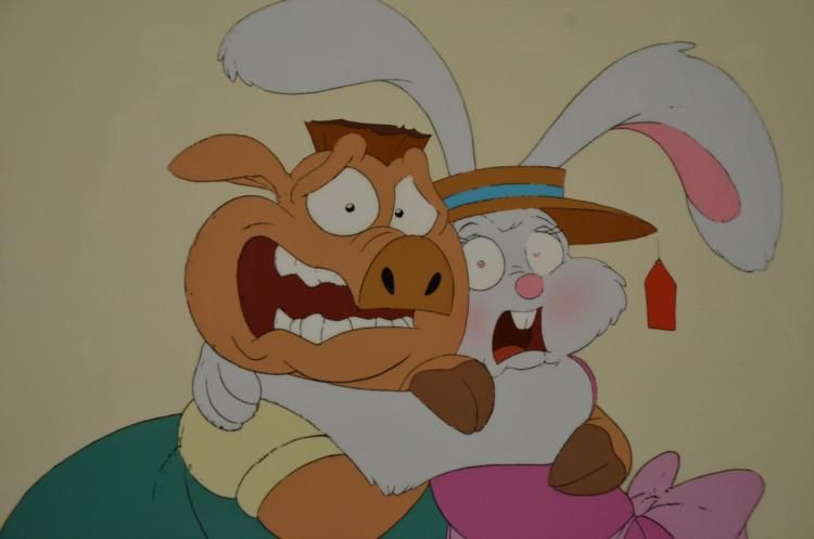 This is an original animation cel used in the production of the 1991 Don Bluth film Rock-A-Doodle. This is a frightening scene, with Stuey Pig and Minnie Rabbit holding each other in fear. * Medium: Hand painted cel acetate Cel image size: 12 x 16 inchesPresentation: Double matted in pink and off-white matte, ready for framingMatte size: 16 x 20 inchesCondition: ExcellentCertificate of Authenticity: Included