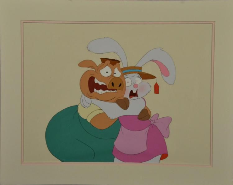 This is an original animation cel used in the production of the 1991 Don Bluth film Rock-A-Doodle. This is a frightening scene, with Stuey Pig and Minnie Rabbit holding each other in fear. * Medium: Hand painted cel acetate Cel image size: 12 x 16 inchesPresentation: Double matted in pink and off-white matte, ready for framingMatte size: 16 x 20 inchesCondition: ExcellentCertificate of Authenticity: Included