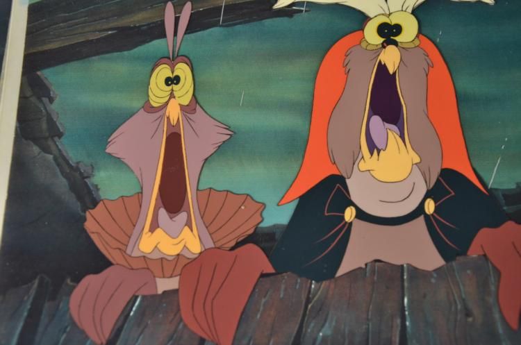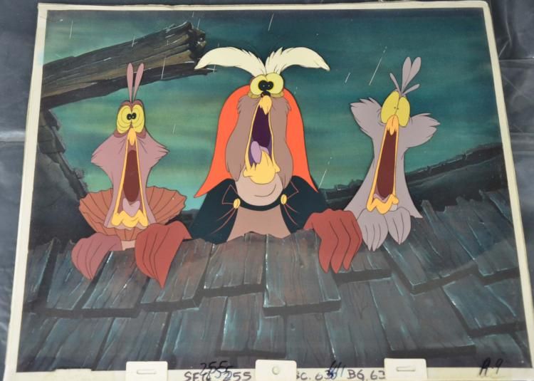 This is an original animation cel used in the production of the 1991 Don Bluth film Rock-A-Doodle. These three birds look crazy scared in this funny scene. * Medium: Hand painted cel acetate with printed background Size: 13 1/2 x 16 1/2 inchesDetails: Animator notations along the lower edgeCondition: ExcellentCertificate of Authenticity: Included