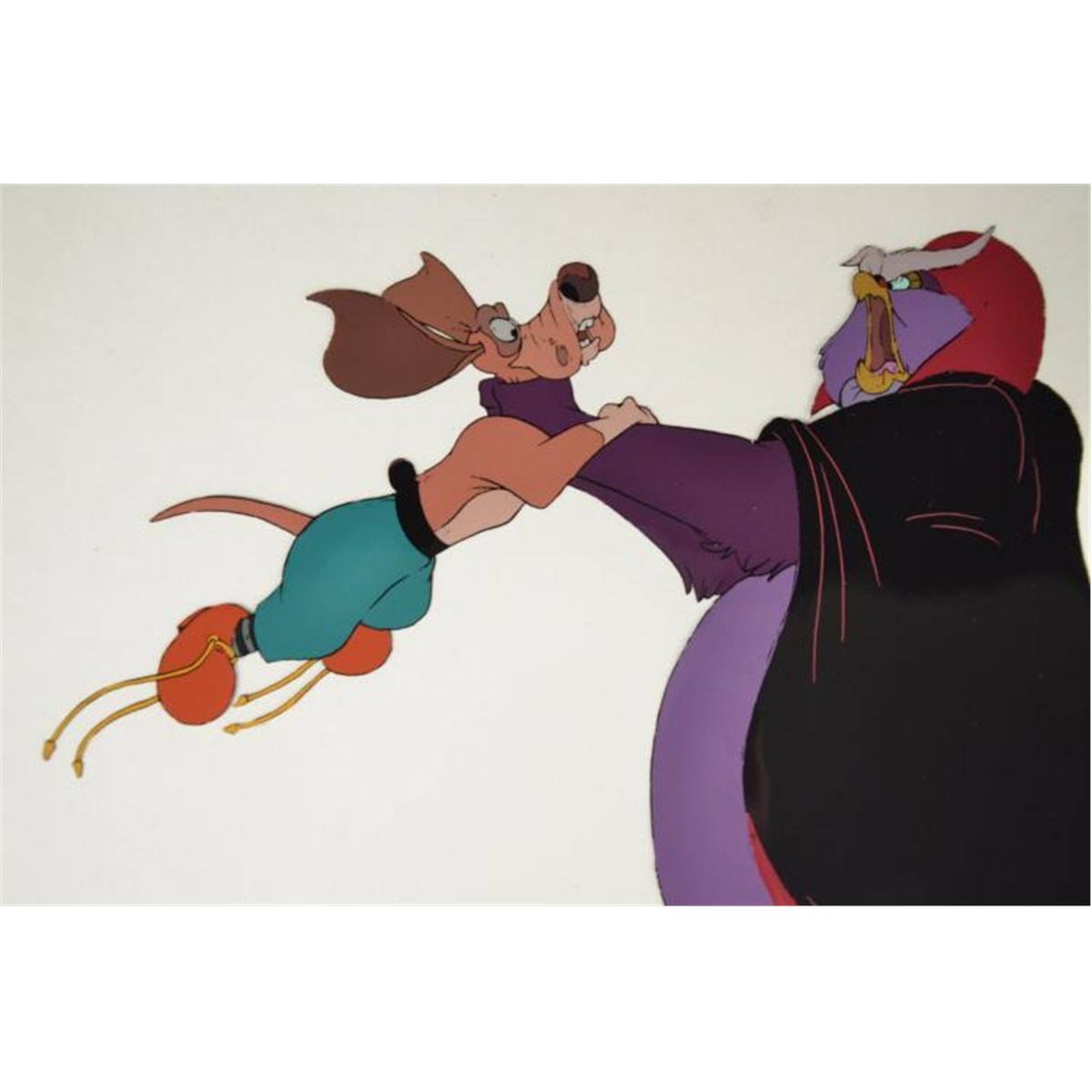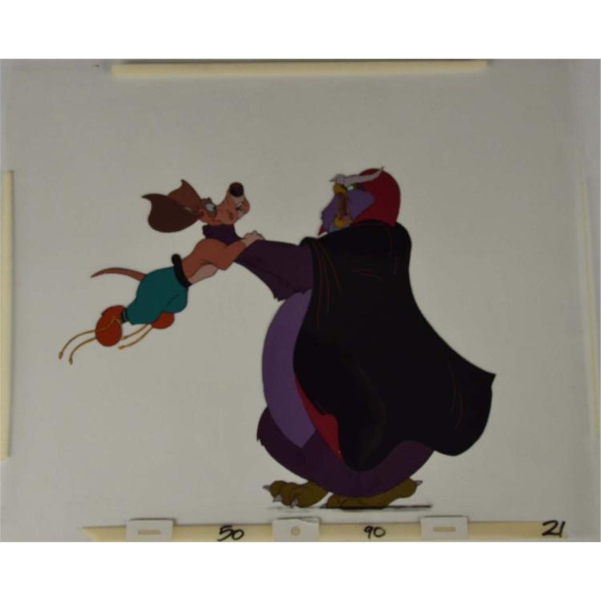 Here is an original animation cel used in the production of the 1991 Don Bluth film Rock-A-Doodle. The evil Grand Duke has got Patou by the collar in this dramatic scene. * Medium: Hand painted cel acetate Size: 13 1/2 x 16 1/4 inchesDetails: Peg holes and animator notations along the lower edgeCondition: ExcellentCertificate of Authenticity: Included