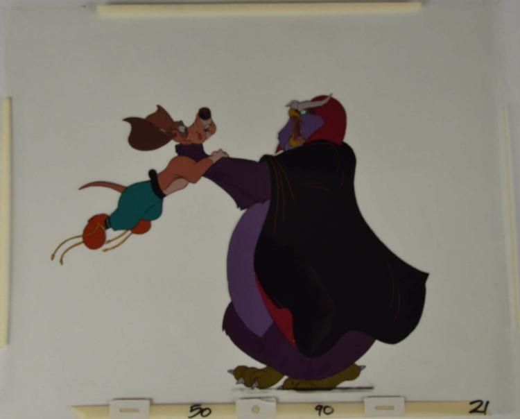 Here is an original animation cel used in the production of the 1991 Don Bluth film Rock-A-Doodle. The evil Grand Duke has got Patou by the collar in this dramatic scene. * Medium: Hand painted cel acetate Size: 13 1/2 x 16 1/4 inchesDetails: Peg holes and animator notations along the lower edgeCondition: ExcellentCertificate of Authenticity: Included