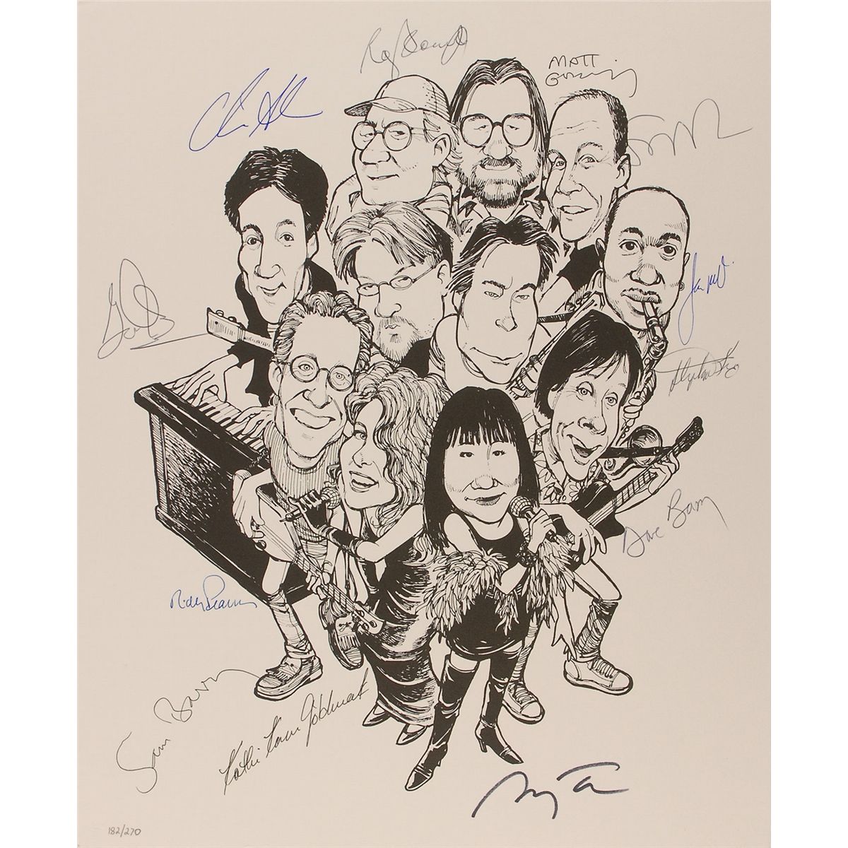 Color limited edition 14 x 17 print of the literary band, numbered #182/270, signed in ballpoint and ink by Stephen King, Amy Tan, Dave Barry, Scott Turow, Mitch Albom, Greg Iles, Matt Groening, Roy Blount, Jr., James McBride, Ridley Pearson, Sam Barry, a