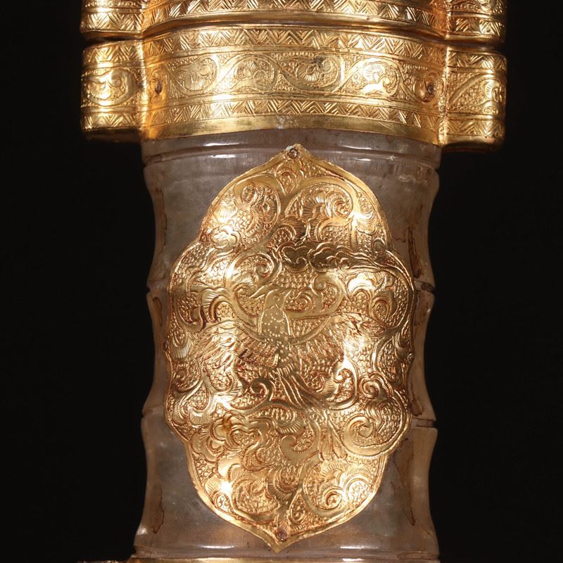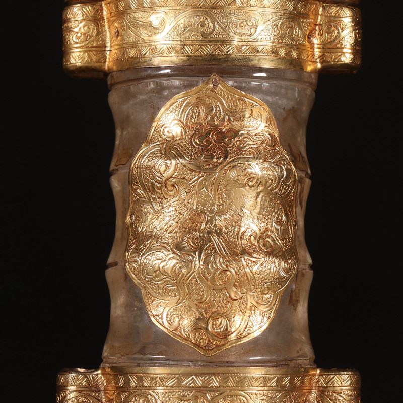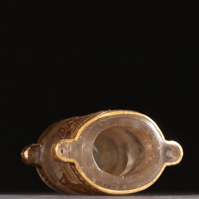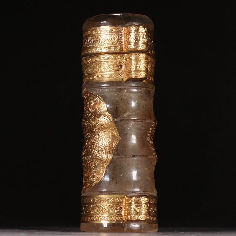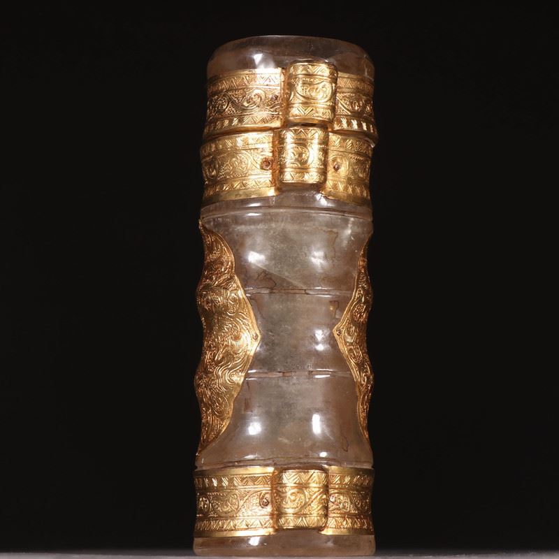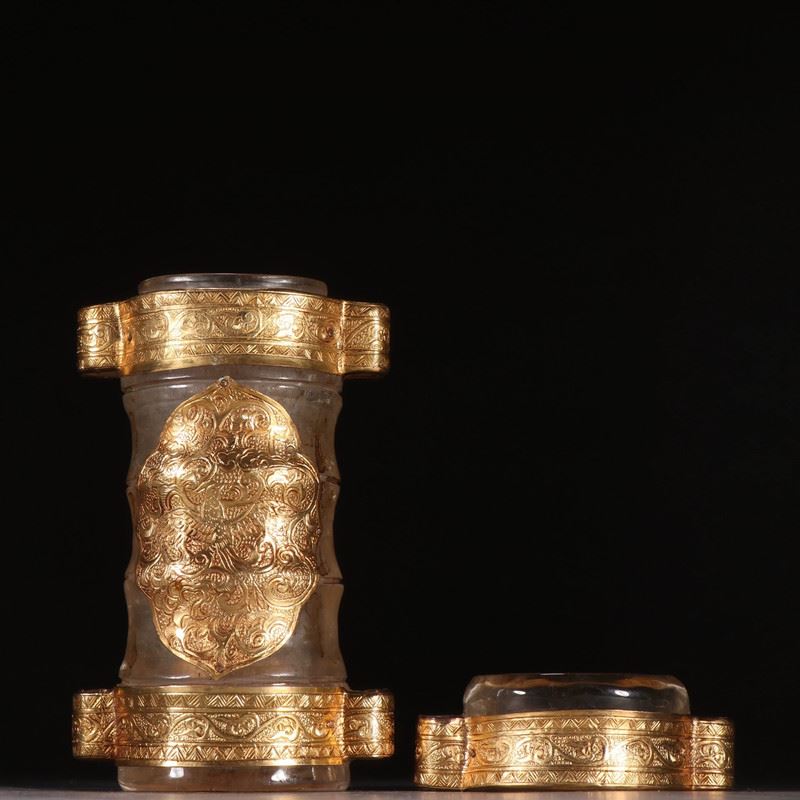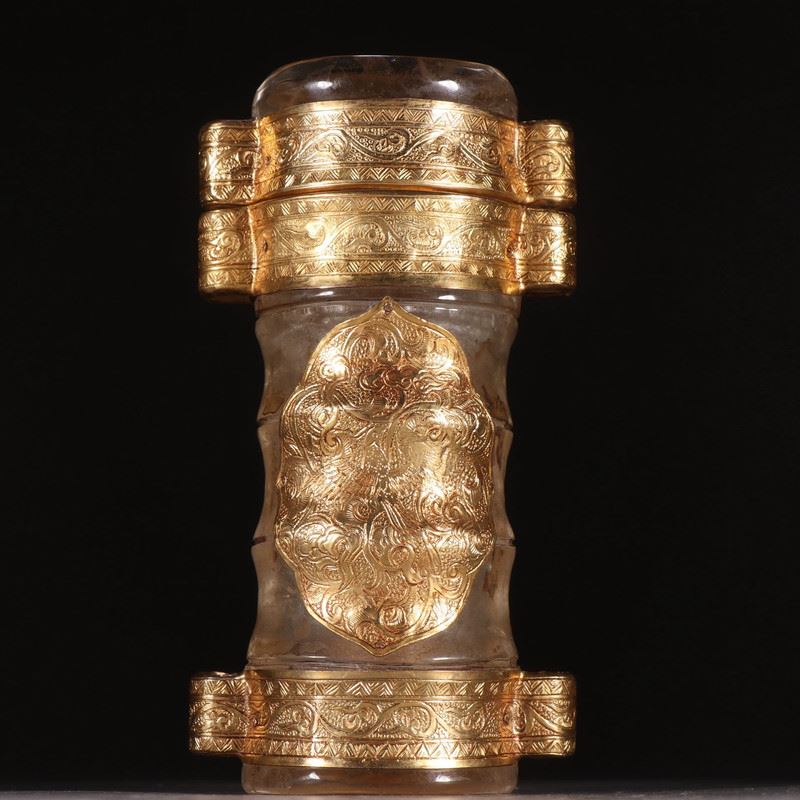 Carved from clear rock crystal, the vessel shows a waisted, swelling profile. It is mounted with multiple gold sheets and cartouche plaques chased with scrolling lotus motifs, while tiered gold bands encircle the neck—rich yet refined. Intended to enshrine Buddhist relics, the interplay of crystal clarity and warm gold creates a solemn, luminous presence—ideal for display and collection.