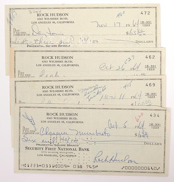 Rock Hudson Personal, Handsigned Checks. Four personal checks engraved "Rock Hudson / 6363 Wilshire Blve. / Los Angeles 48, California," handsigned "Rock Hudson," and filled out by him in October and November, 1964, on Security First National Bank. One is made out to Cash for $111.00, one to Dayton's for $63.80, one to Clarence Murimoto for $6.40, and one to Peter Launder for $100.00. Cncellation perforations lightly affect the signatures, which are boldly signed in blue ink.