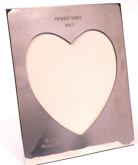 Rock Hudson's Cartier Pewter Picture Frame - A Gift From Elizabeth Taylor. Lovely 11 x 9" Cartier picture frame with a large heart shape for the photograph engraved at the top "Private Lives / 1983"; at lower left: "Darling Rock & Tom" and at lower right: "Love Elizabeth." One small scratch and a couple of tiny dings. With original gray felt bag (somewhat soiled) from Cartier. Tom was Hollywood publicist Tom Clark, Hudson's long-time companion. A beautiful picture frame given to Hudson by his very good friend and champion, Elizabeth Taylor, whom he met in 1956 when they starred with James Dean in "Giant." Taylor appeared on Broadway with Richard Burton in a revival of "Private Lives" in 1983. Hudson's battle with AIDS and resulting death in 1985 put a face to AIDS and led to Miss Taylor's personal involvement in bringing attention to and trying to find a cure for AIDS.