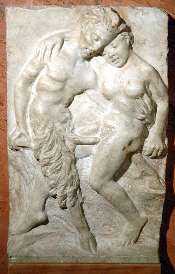 Rock Hudson's Classical Marble Statuary. Marble panel 3½ x 8½" x 2" deep, depicting a satyr raping a nymph. In Greek mythology, satyrs are half-human, half -beast deities of the woods and mountains. They usually have a goat's tail, flanks and hooves. Since they are the companions of Dionysus, the god of wine, they spend their time drinking, dancing, and chasing nymphs, who are female spirits of nature. This panel was bought by Hudson on one of his shopping trips to Europe and was part of the decoration of his home in Beverly Hills. The panel has been affixed at the back to 24 x 18" x 5½" wooden frame for safekeeping, which can be removed.
