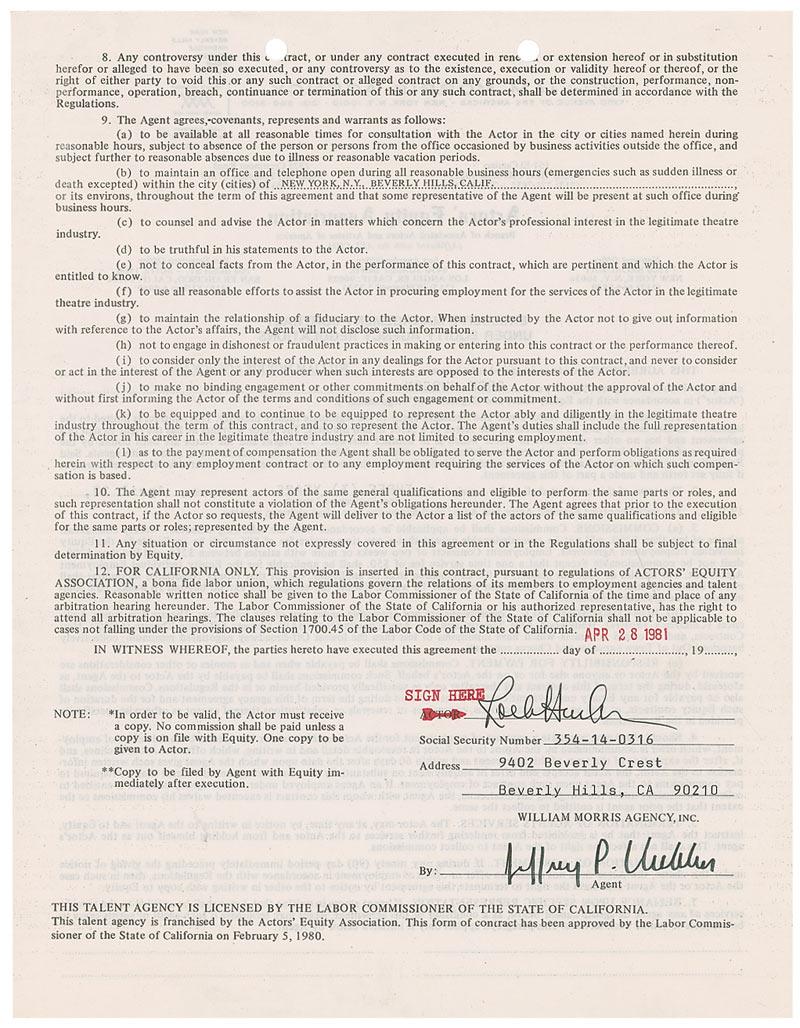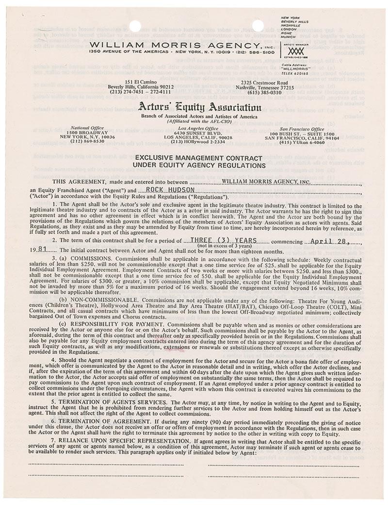 DS, signed “Rock Hudson,” one page both sides, 8.5 x 11, April 28, 1981. Exclusive Management Contract between the actor and the William Morris Agency. In part: “The Agent shall be the Actor’s sole and exclusive agent in the legitimate theatre industry…The term of this contract shall be for a period of THREE (3) YEARS commencing April 28, 1981…Weekly contractural salaries of less than $250 will not be commissionable…should the engagement extend beyond 16 weeks, 10% commission will be applicable.” In fine condition, with two filing punch holes at the top of the page and show-through from two stampings on the reverse.