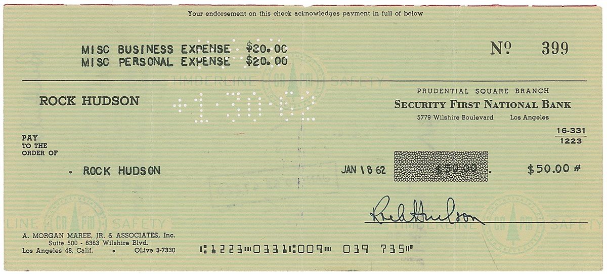 Personal check, 8.25 x 3.75, filled out in type and signed by Hudson, payable to Rock Hudson for $50.00, January 18, 1962. Check is also endorsed on the reverse, “Rock Hudson.” In fine condition, with three vertical folds, one through a single letter of signature, and cancellation holes near the top.