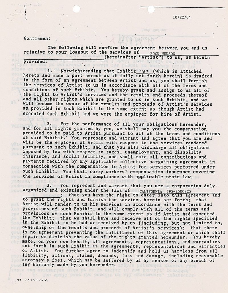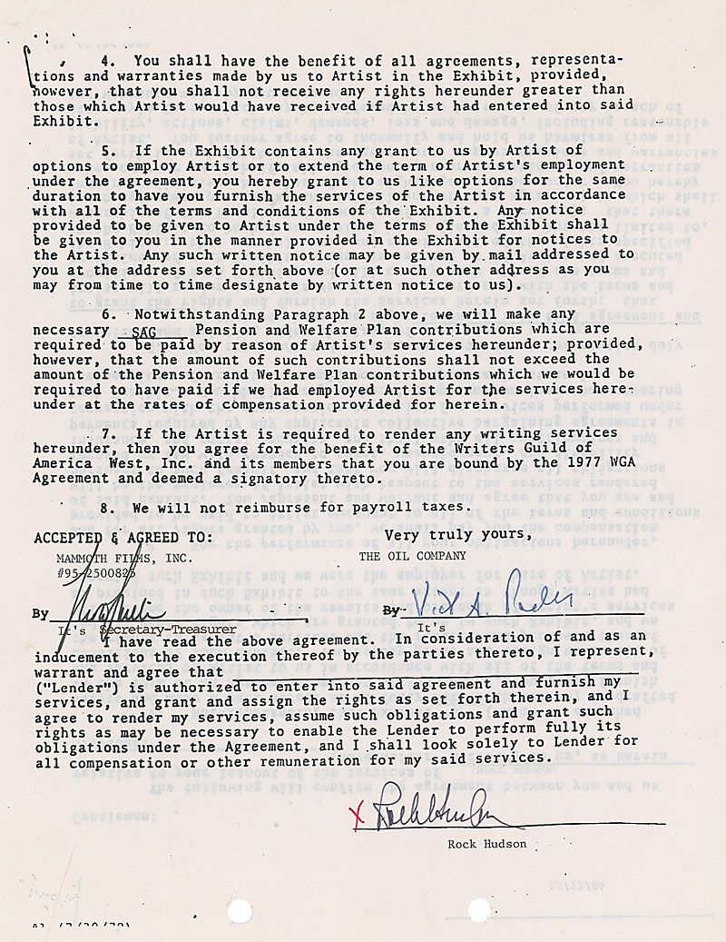 DS, one page both sides, 8.5 x 11, October 22, 1984. Agreement for loan out services between Mammoth Films and The Oil Company, signed at the conclusion by Hudson. In fine condition, with expected document wear.