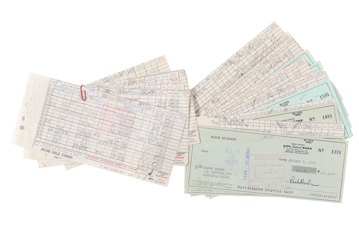 Collection of nine personal checks, 8.5 x 3.25, all filled out in type and signed by Hudson, made payable to Adohr Farms for various amounts, all dated 1970. Includes over 30 receipts filled out by a store clerk recording Hudson’s orders, consisting of items such as eggs, butter, and cheese. In overall fine condition, with expected bank stamps. Accompanied by a certificate of authenticity from the manager of Hudson’s estate.
