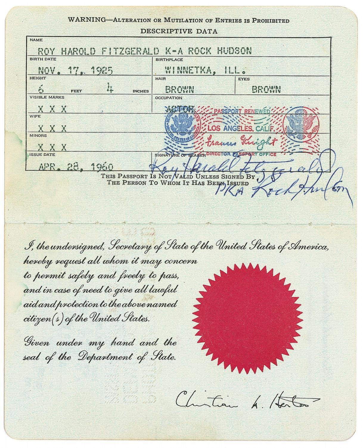 Hudson’s US passport, 20 pages, 3.75 x 6, issued April 28, 1960, signed twice in blue ink, “Roy Harold Fitzgerald PKA Rock Hudson” (once upon his passport photo, again in the passport itself). Numerous stamps include trips to London, Rome, Mexico City, Mazatlan, and Curacao. Passport renewal stamp touch the top of his birth name, slight water staining along the bottom, slight corner bend to the second page, and expected government punch holes, otherwise in fine condition.