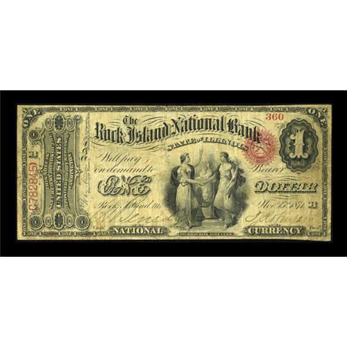 <B>Rock Island, IL</B></I> - $1 Original Fr. 382 <B>The Rock Island NB</B></I> Ch. # 1889<BR> From our 2007 FUN sale, where we described, "A nice <B>Fine-Very Fine</B></I> note from an in demand but seldom available location. The signatures are still quite legible and perhaps the only distraction one might quibble about is an unobtrusive margin split at top. The census includes just eight Large Size from here, only two of which are FCP Aces. This institution was chartered in 1871 and closed its doors in 1915. A real treasure for the Illinois collecting fraternity to battle over. Expect the final realization to be in the range of..." Since that sale, only one additional Large note has been added to the census. <BR><BR><b>Shipping:</b> Coins & Currency (<a target="_blank" href="http://www.heritageauctions.com/common/shipping.php">view shipping information</a>)