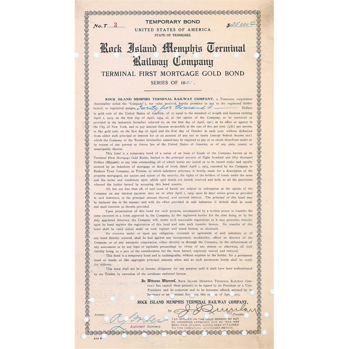 1915, Temporary Bond for $25,000 bearing 5% interest. Black. No vignette. Scarce. Four rows of hole cancellations. Fine.