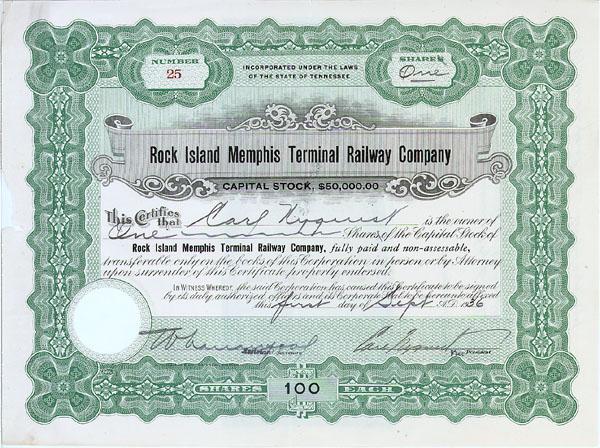 1920, Stock certificate for 1 share. Green/Black. Litho. Ornate border. No vignette. Scarce. A small issue and scarce. Stamp and punch cancelled. Very fine.