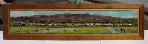 Rock Island Railroad reverse glass panoramic sign. Mexican version on 3 known of this version, some normal bleeding to mother of pearl inlay otherwise Ex. cond. 7' x 23" including frame.